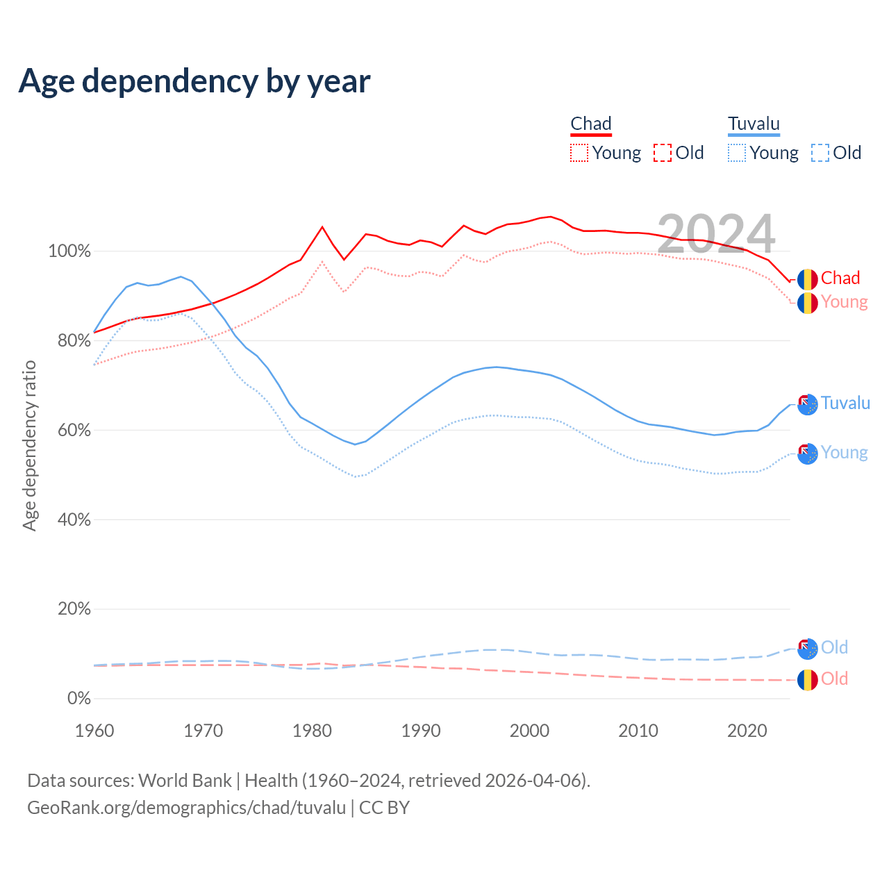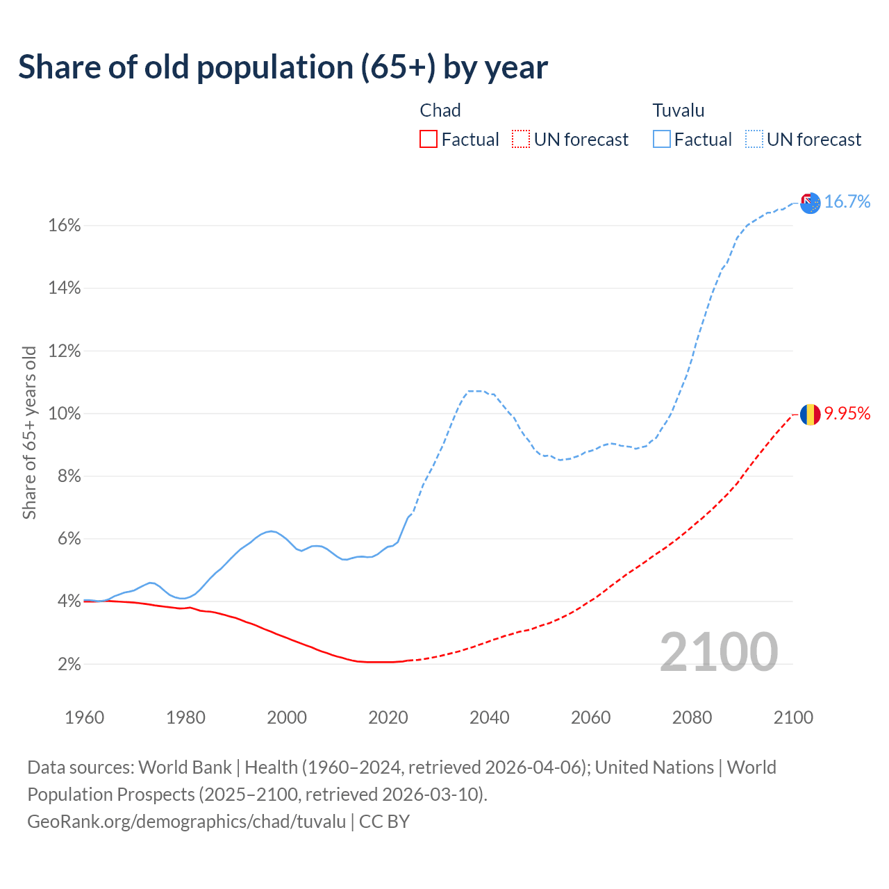 - The share of old-age demographic (65+) in Chad is 2.1% vs 6.67% in Tuvalu.