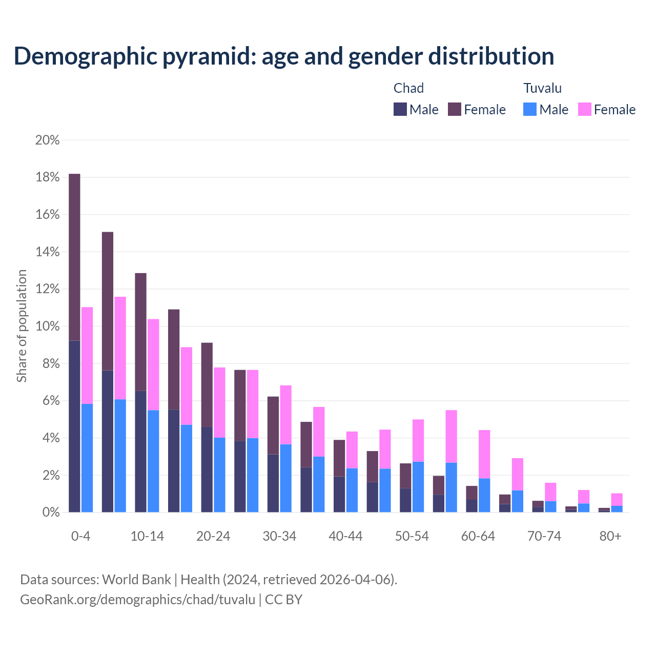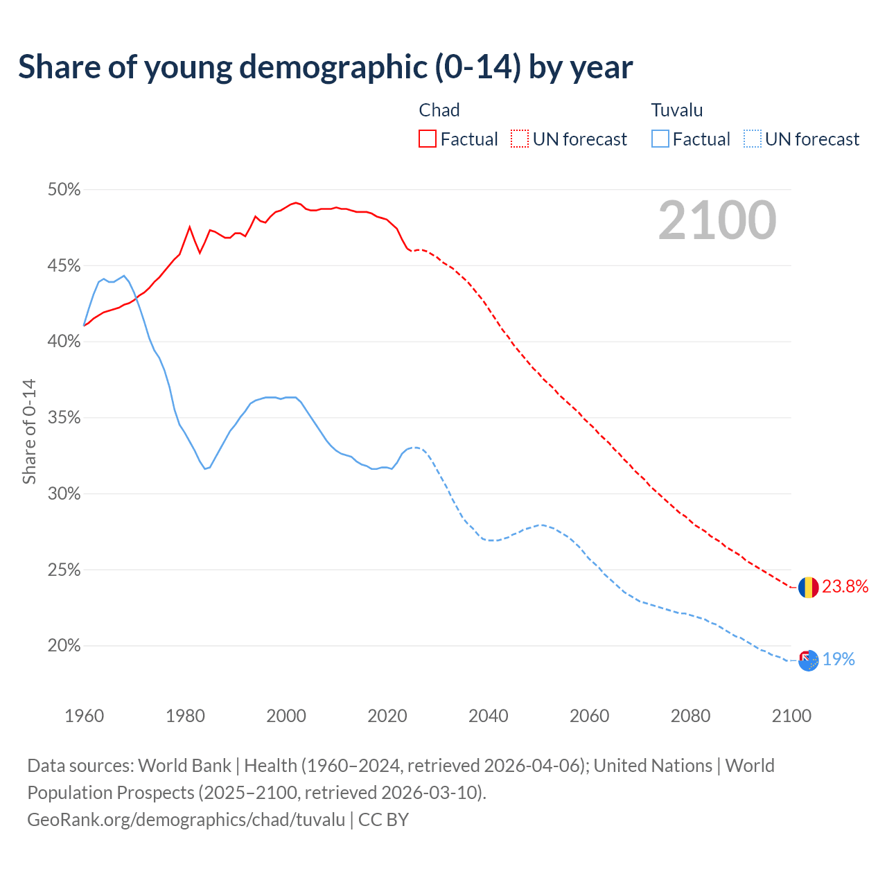 - The share of young demographic (0-15 years old) in Chad is 46.1% vs 32.9% in Tuvalu.