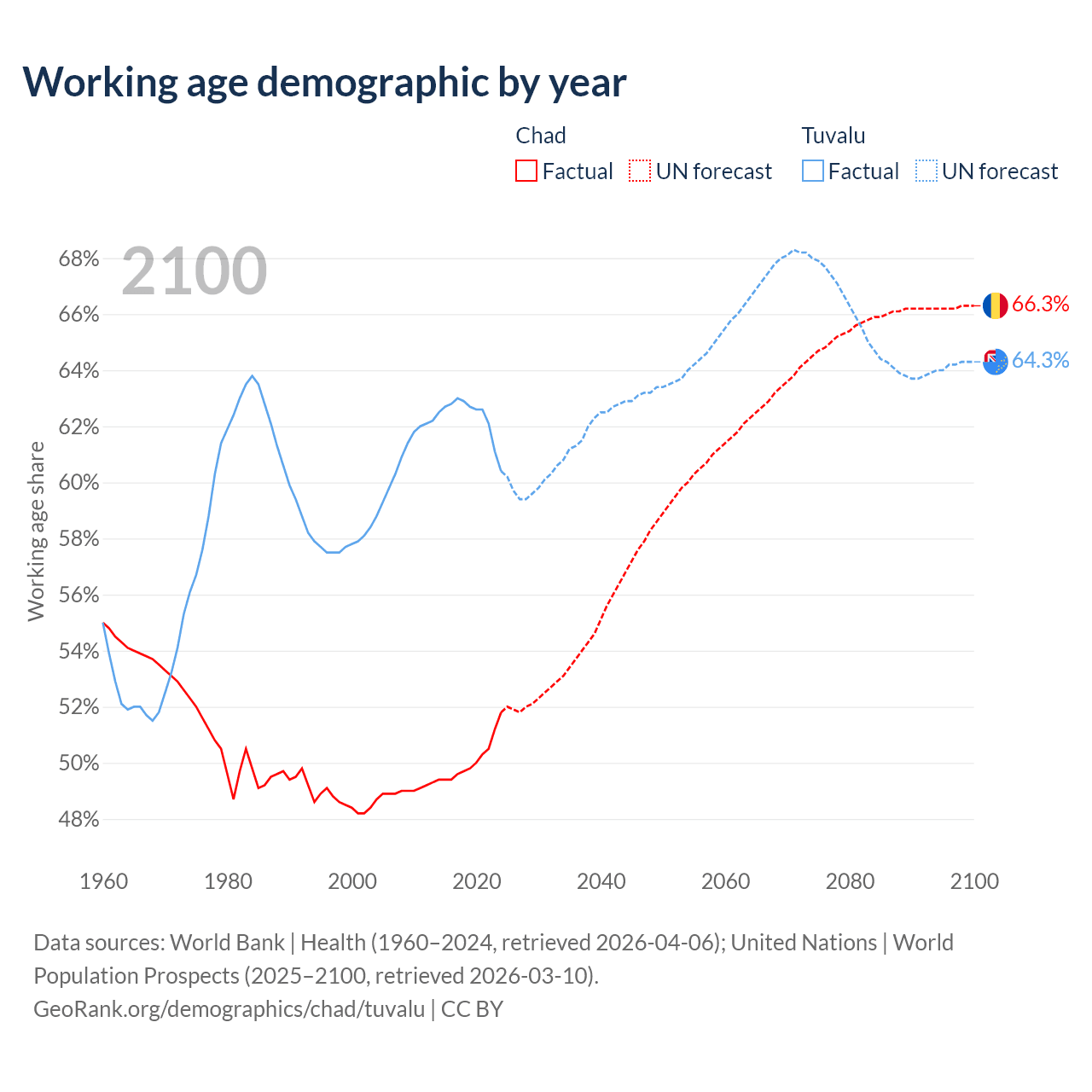 - Chad has 11.3M working age adults (aged 15-64) vs 5.64K in Tuvalu.