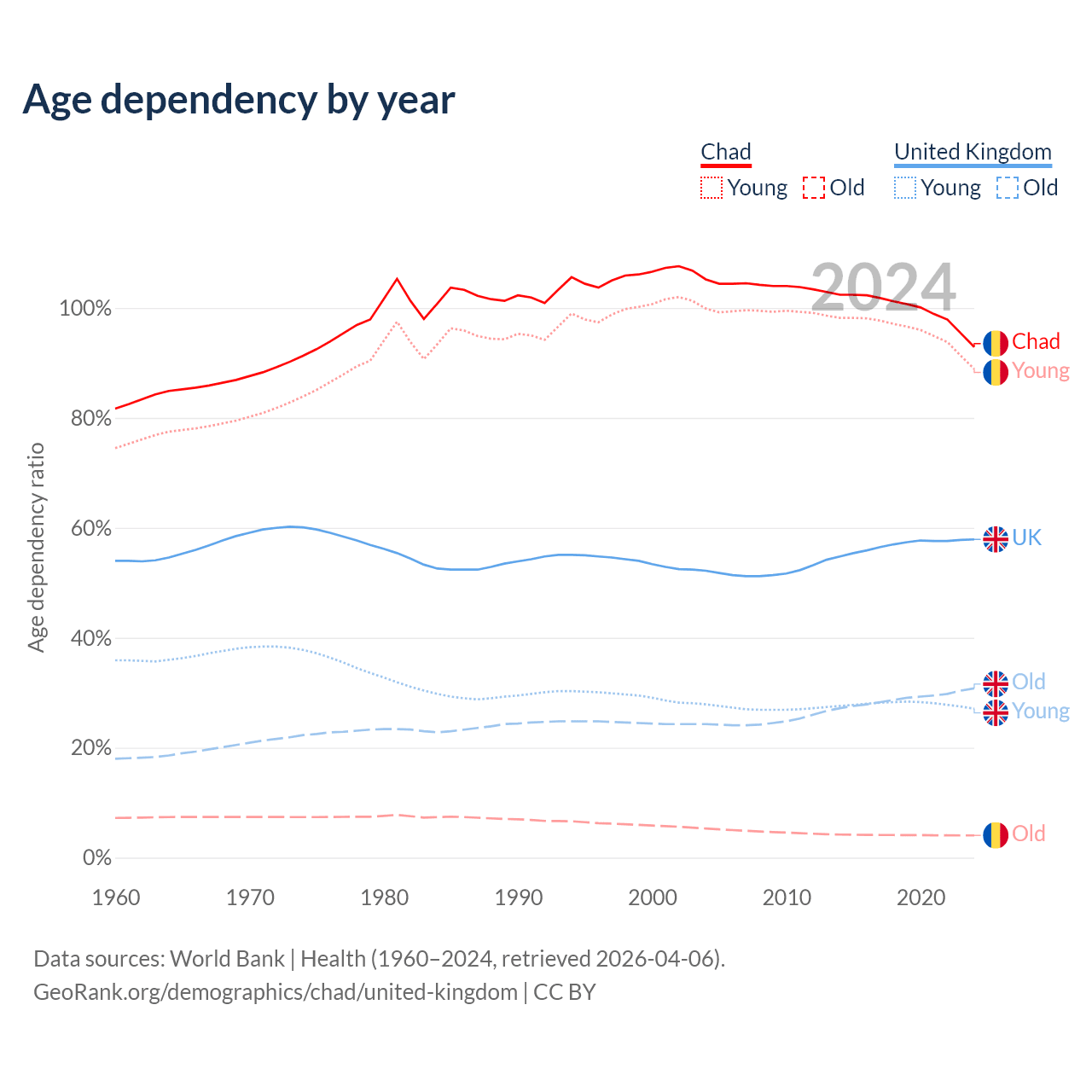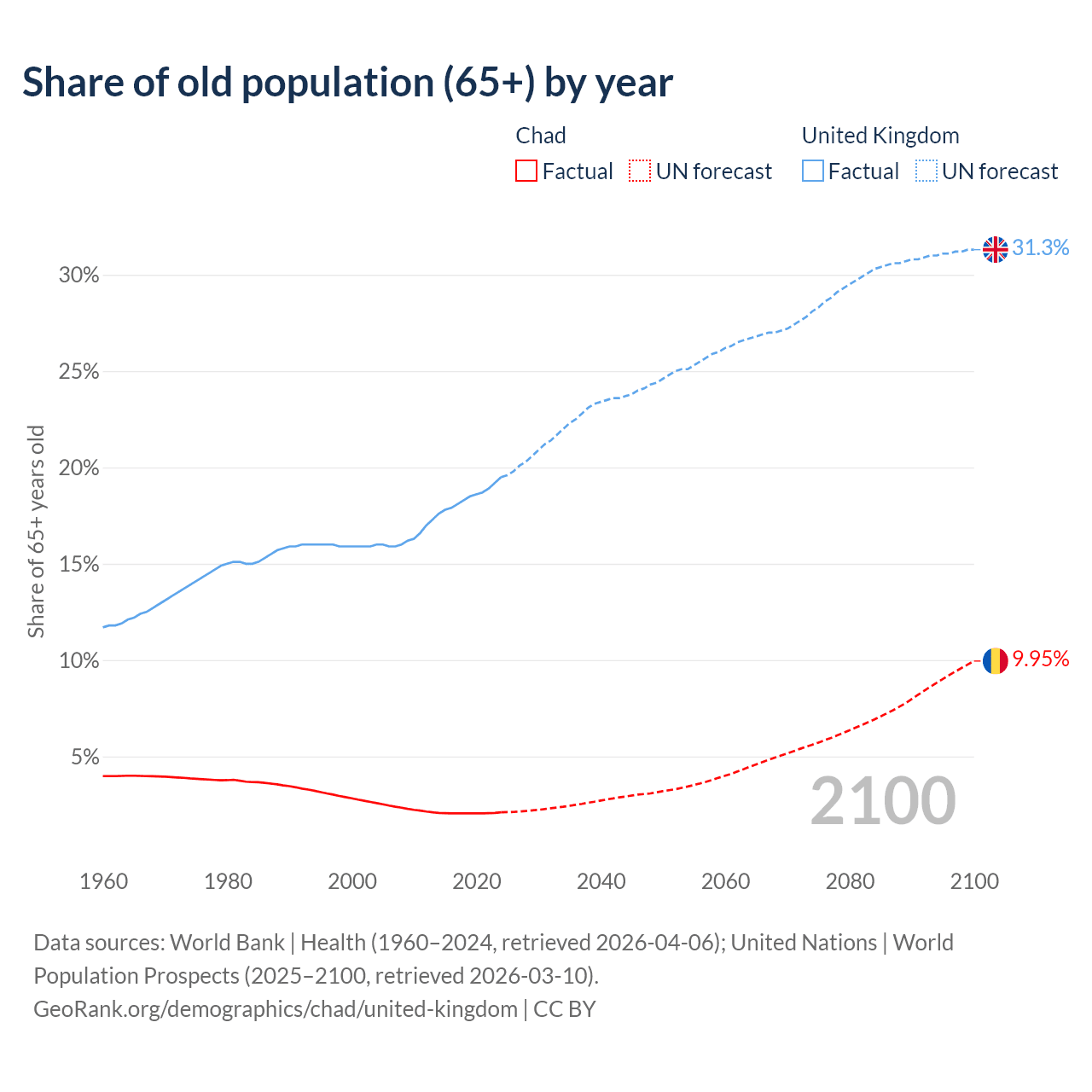 - The share of old-age demographic (65+) in Chad is 2.1% vs 19.5% in the United Kingdom.