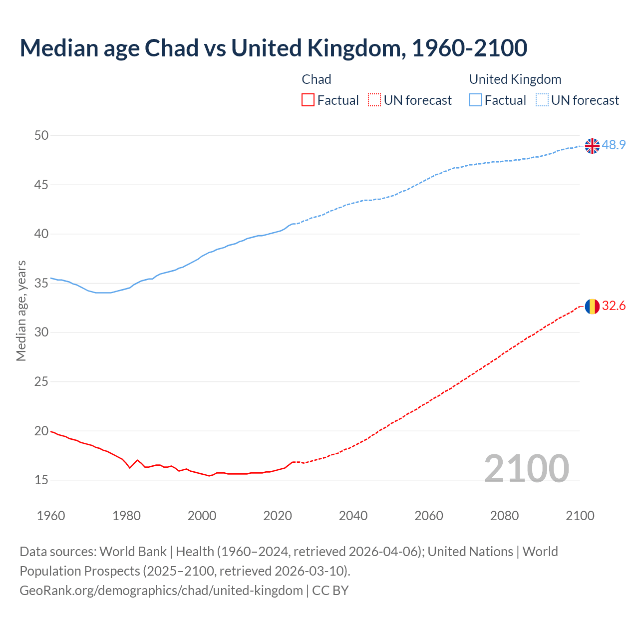 - The median age in Chad is 16.8 years compared to 41 years in the United Kingdom.
