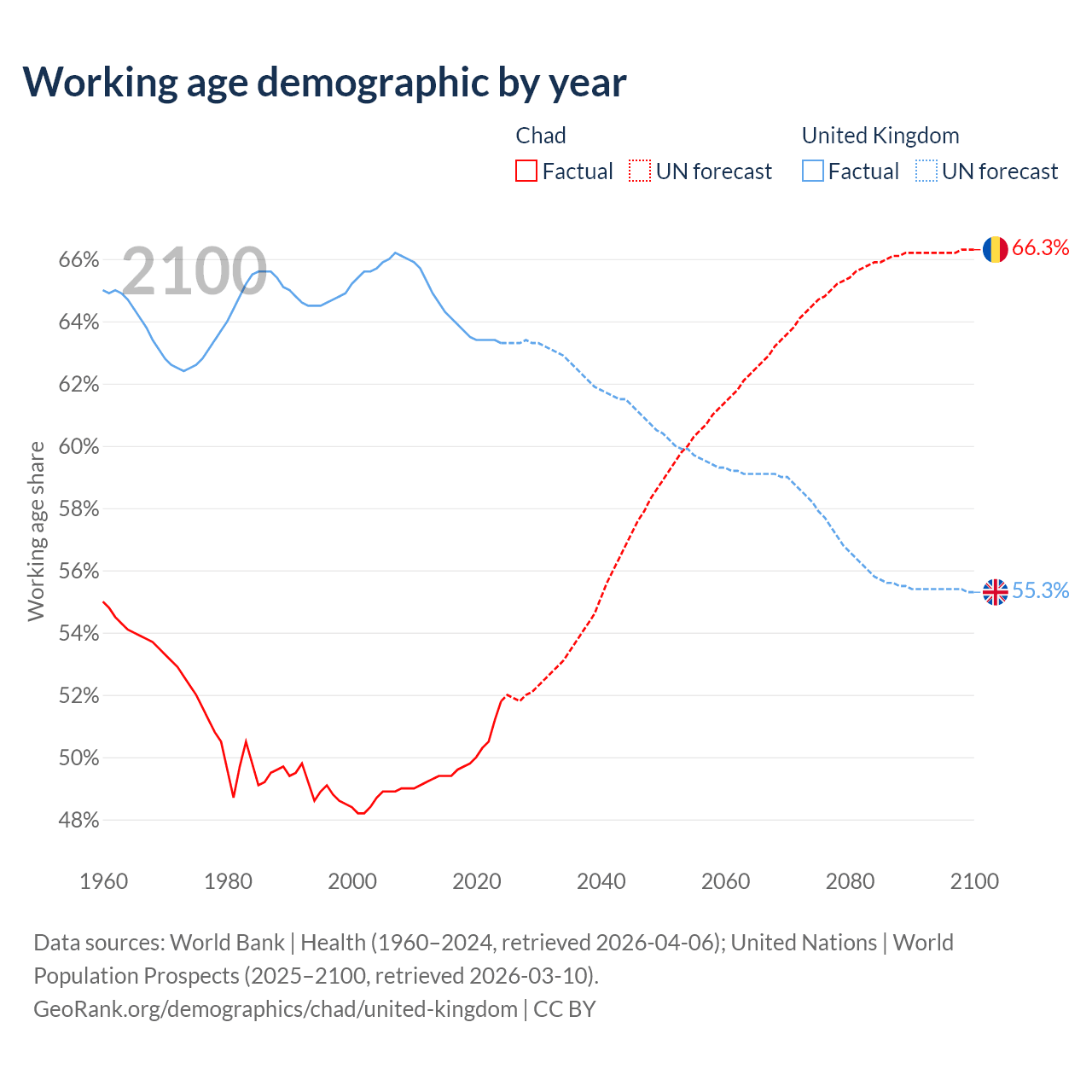 - Chad has 11.3M working age adults (aged 15-64) vs 44.4M in the United Kingdom.