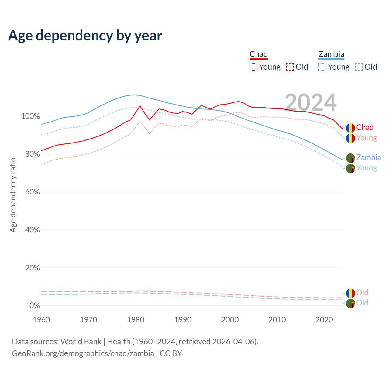 - Chad is ranked 192/196 by median age (oldest to youngest) vs 182/196 for Zambia.