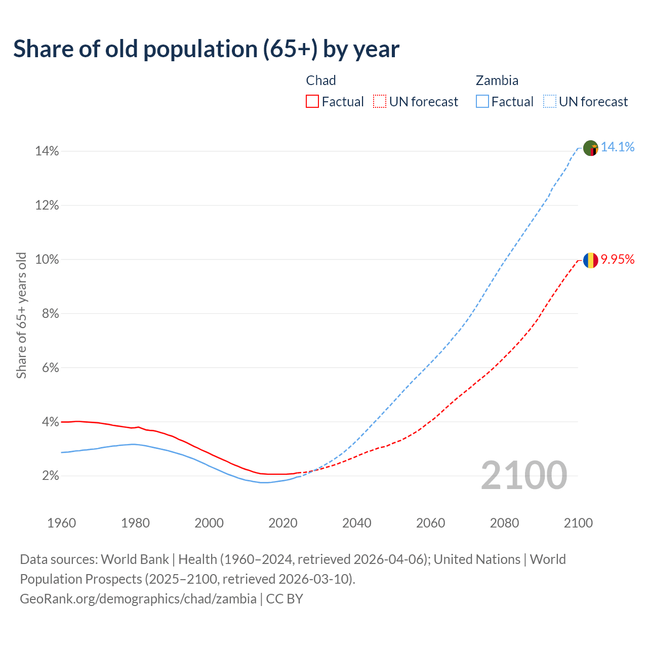 - The share of old-age demographic (65+) in Chad is 2.1% vs 1.95% in Zambia.