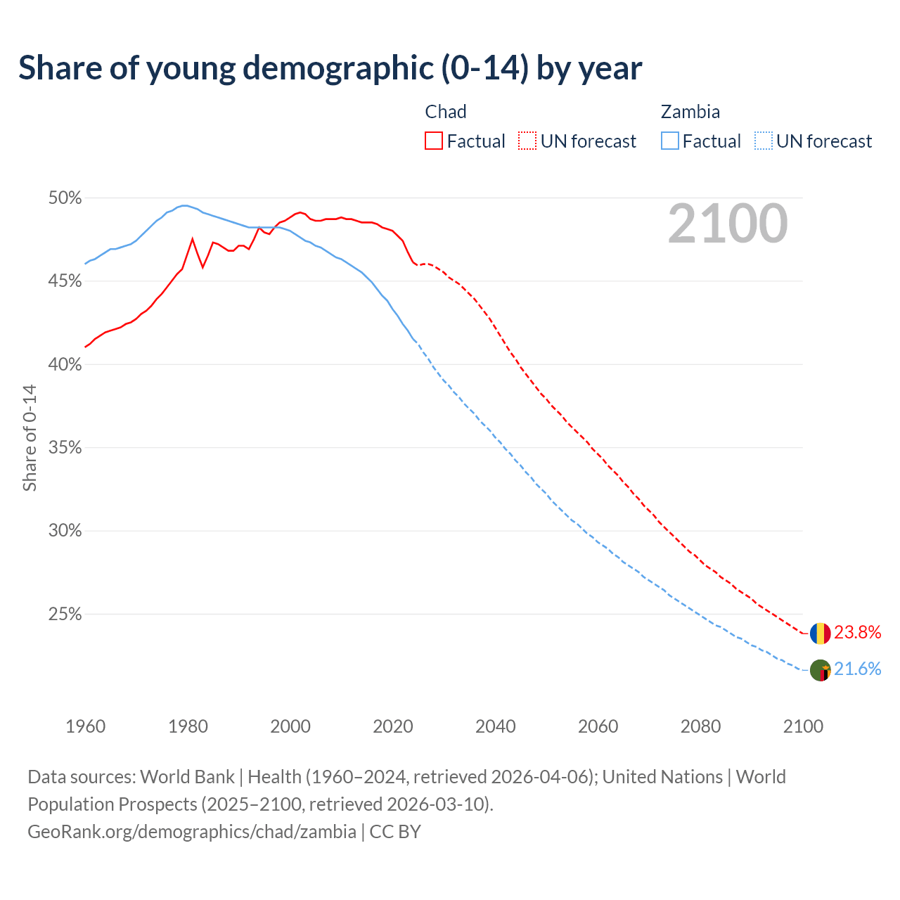 - The share of young demographic (0-15 years old) in Chad is 46.1% vs 41.5% in Zambia.