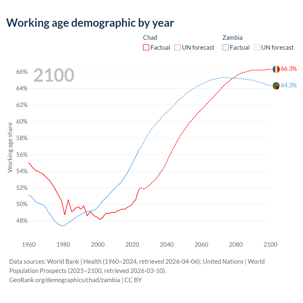 - Chad has 11.3M working age adults (aged 15-64) vs 12.8M in Zambia.