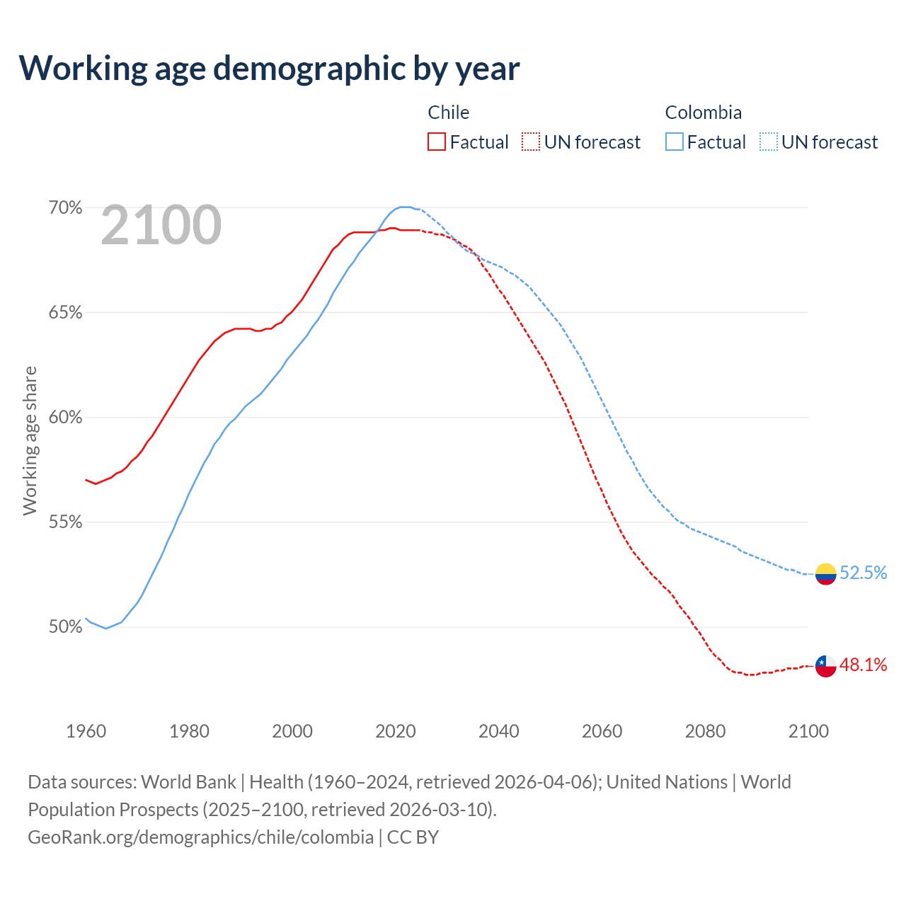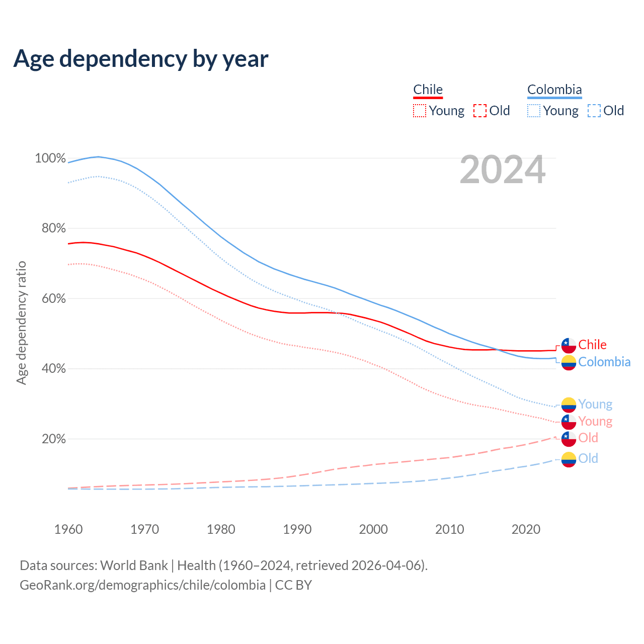 - Chile is ranked 61/196 by median age (oldest to youngest) vs 89/196 for Colombia.