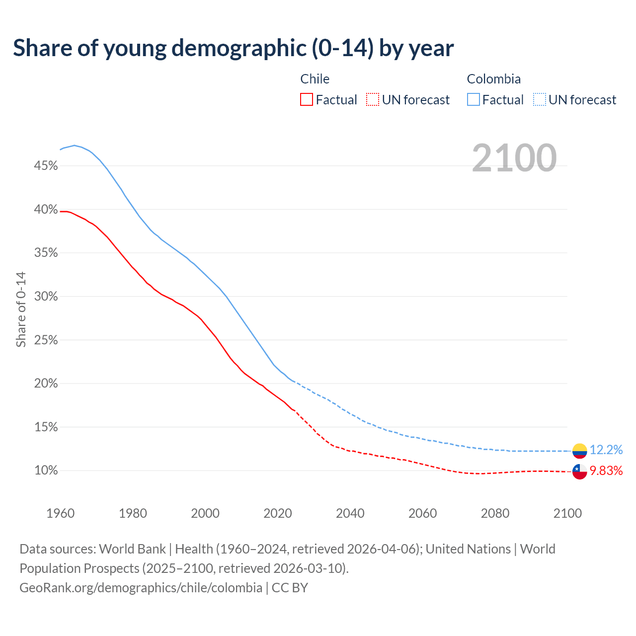 - The share of young demographic (0-15 years old) in Chile is 17% vs 20.3% in Colombia.