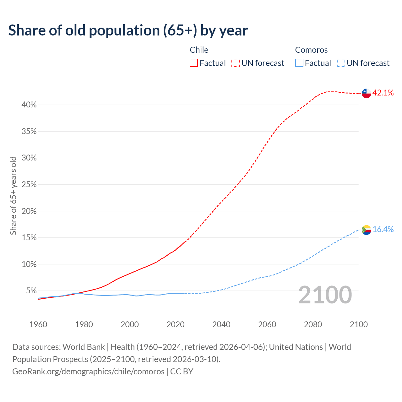 - The share of old-age demographic (65+) in Chile is 14.1% vs 4.47% in Comoros.