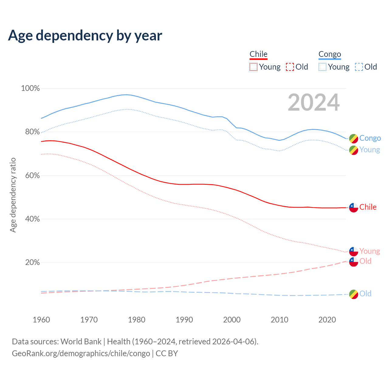The share of older people aged 65 and over is 14.1% in Chile and 2.99% in the Congo. Life expectancy in Chile compared to the Congo .