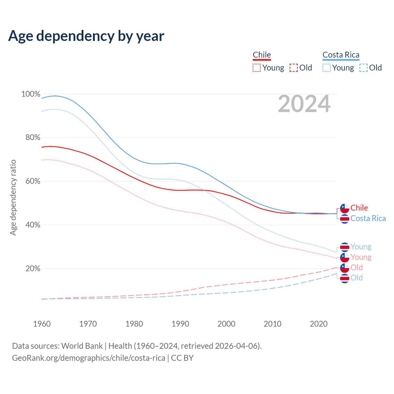 Data sources: World Bank | Health (1960–2024, retrieved 2026-04-06); U.S. Census Bureau (1960–2024, retrieved 2026-02-08).
