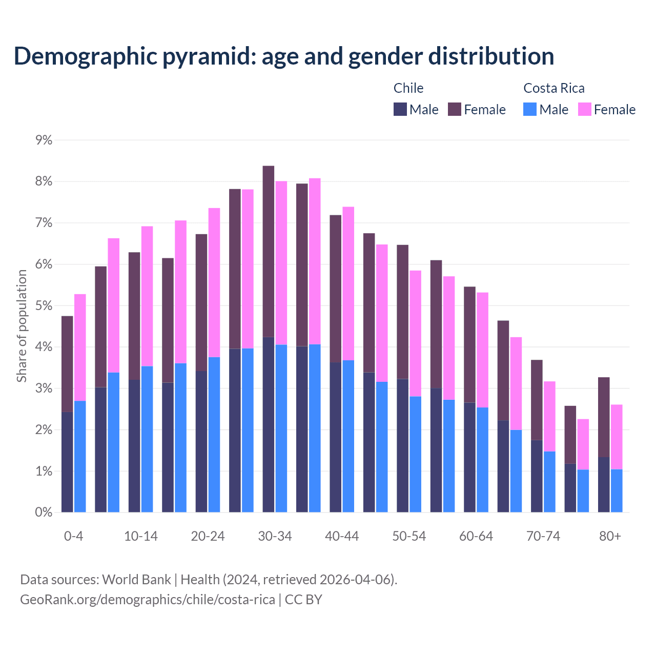 - Chile is ranked 61/196 by median age (oldest to youngest) vs 72/196 for Costa Rica.