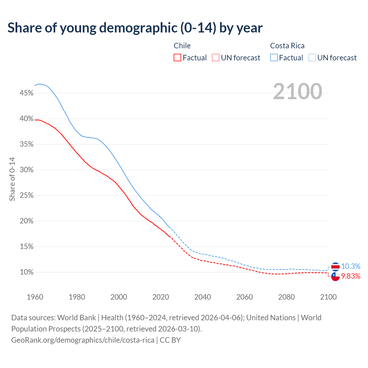 - The share of young demographic (0-15 years old) in Chile is 17% vs 18.8% in Costa Rica.