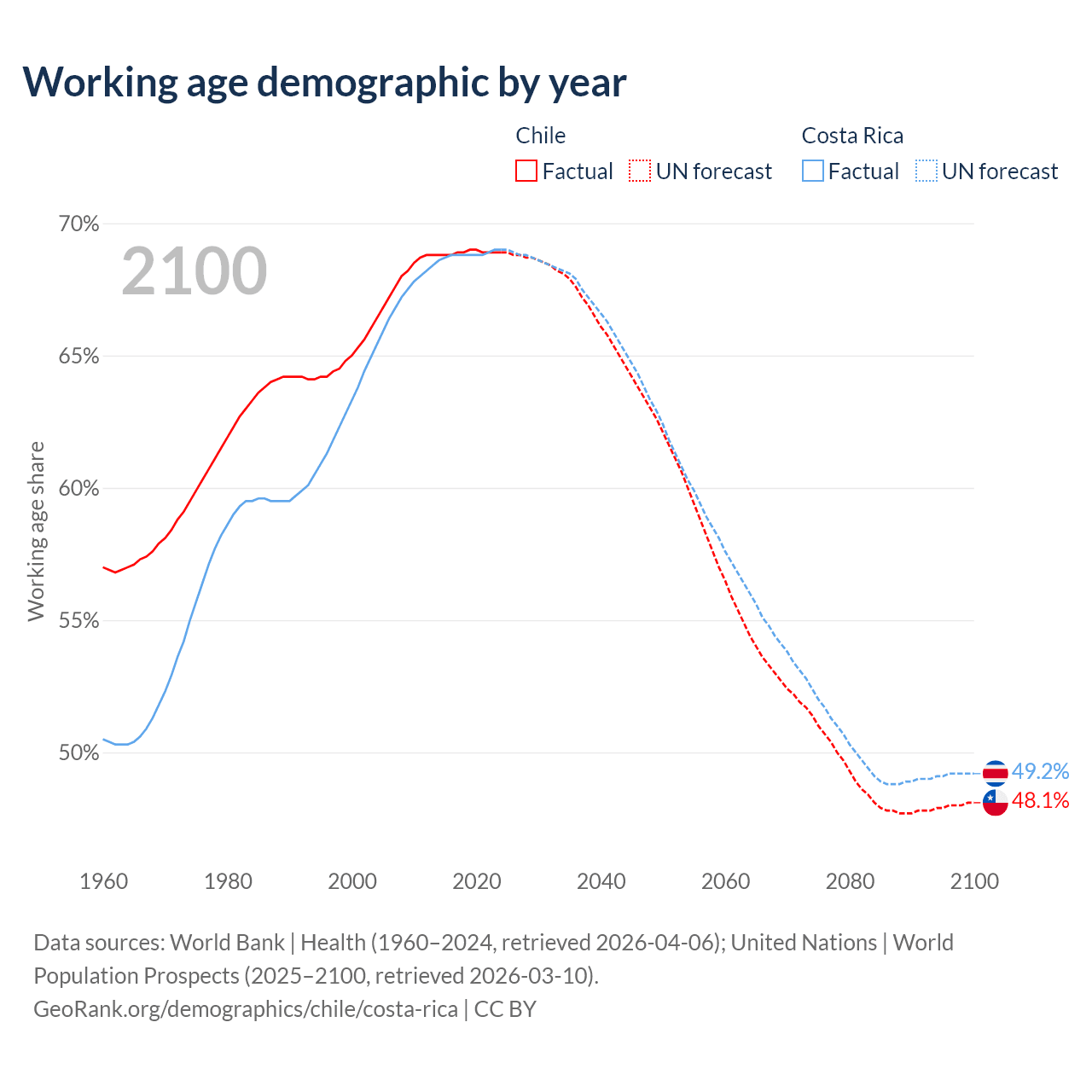 Median age Chile vs Costa Rica, 1960-2100