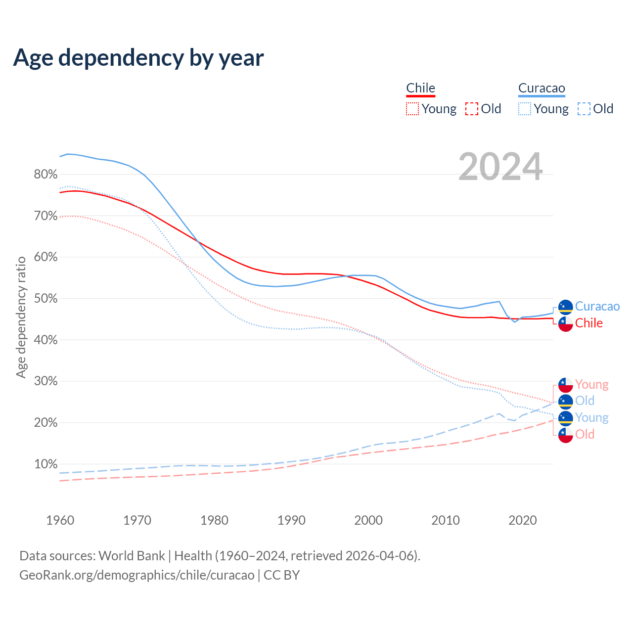 - The share of old-age demographic (65+) in Chile is 14.1% vs 16.8% in Curacao.
