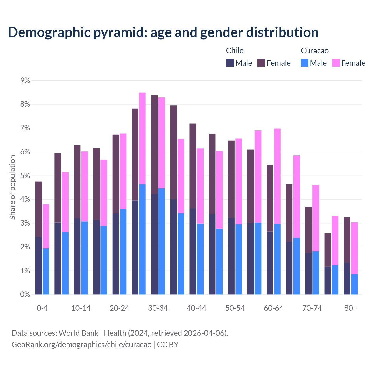 The share of older people aged 65 and over is 14.1% in Chile and 16.8% in Curacao. Life expectancy in Chile compared to Curacao .