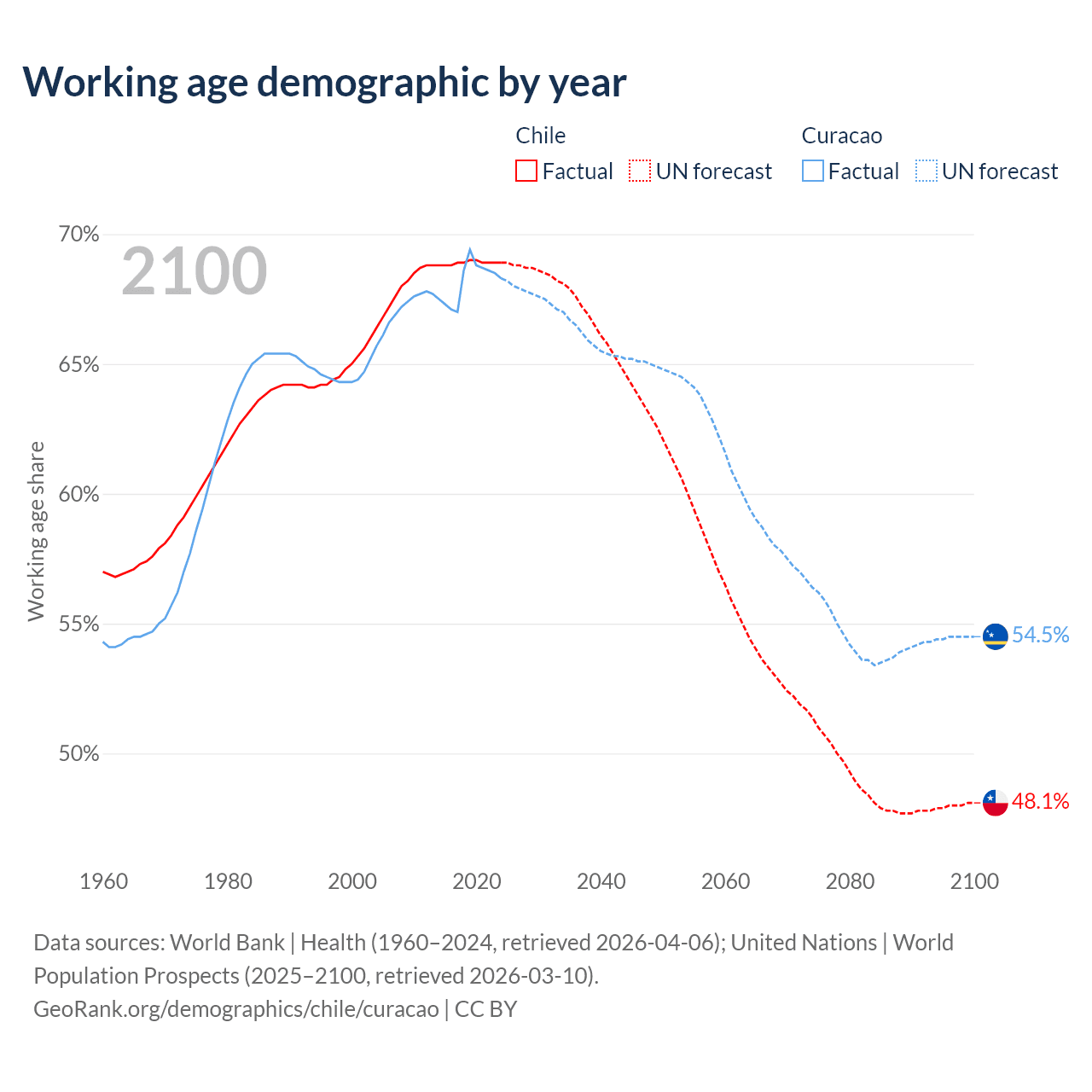 Median age Chile vs Curacao, 1960-2100