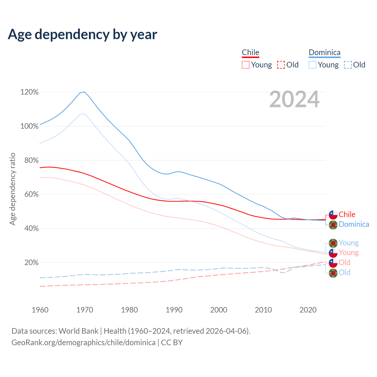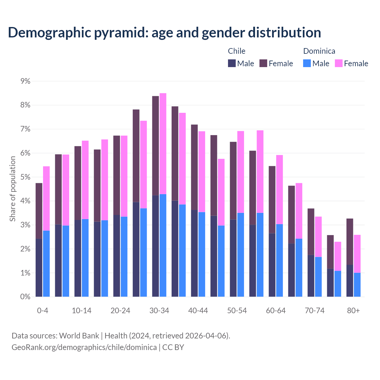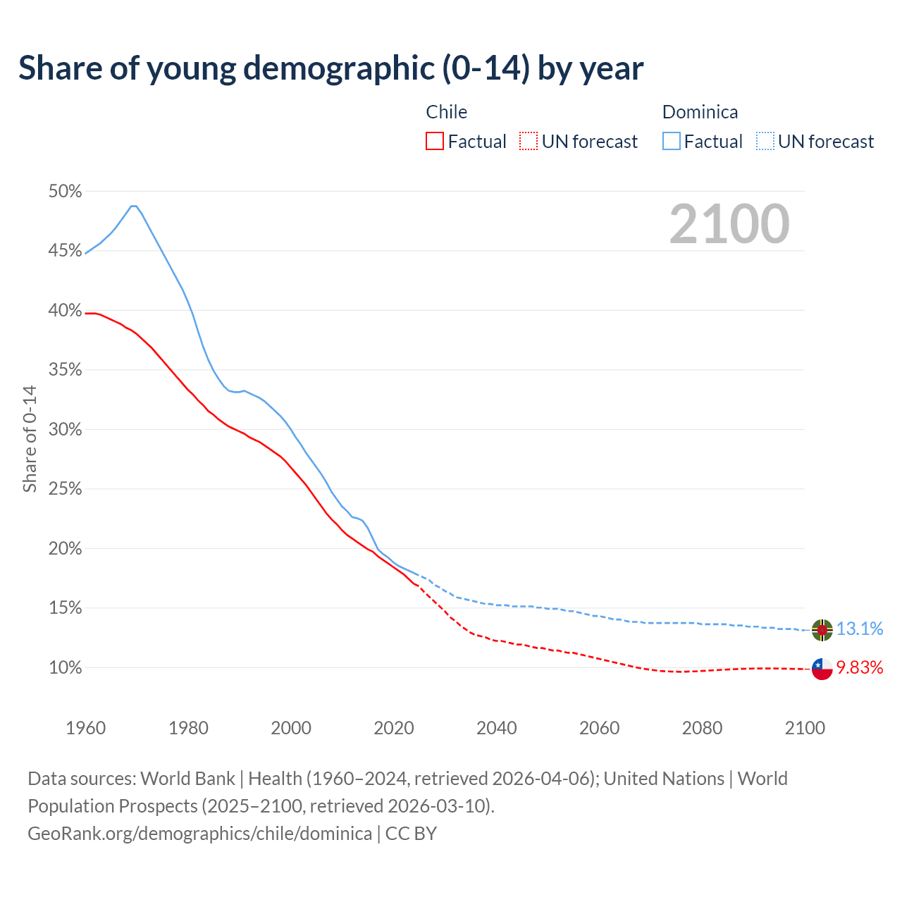 - The share of young demographic (0-15 years old) in Chile is 17% vs 17.9% in Dominica.