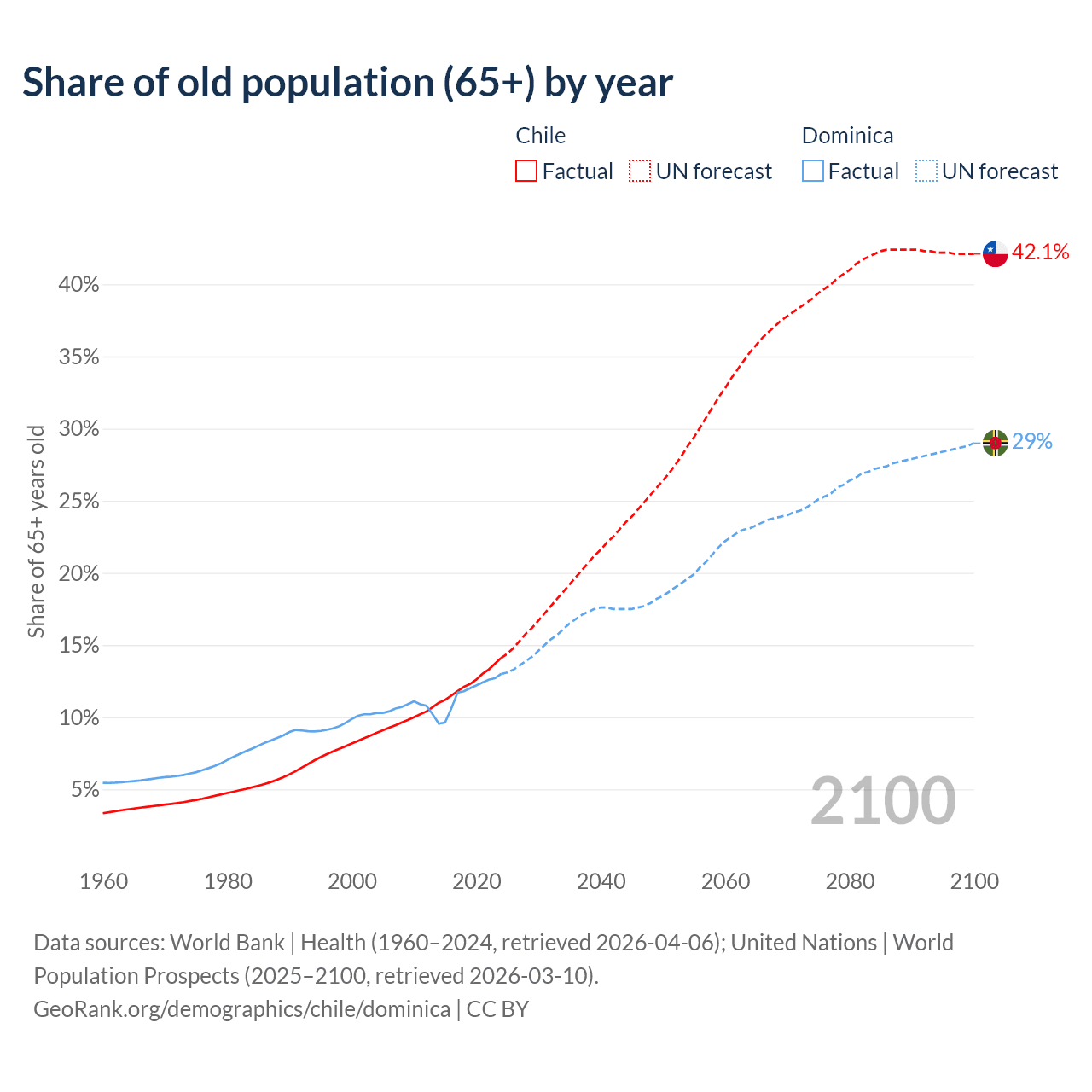 The share of older people aged 65 and over is 14.1% in Chile and 13% in Dominica. Life expectancy in Chile compared to Dominica .