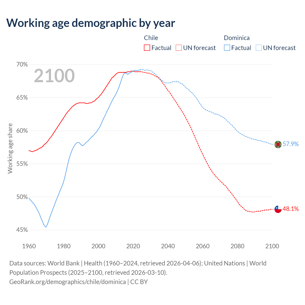 - Chile has 13.8M working age adults (aged 15-64) vs 45.3K in Dominica.