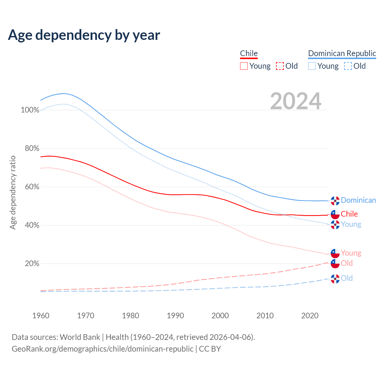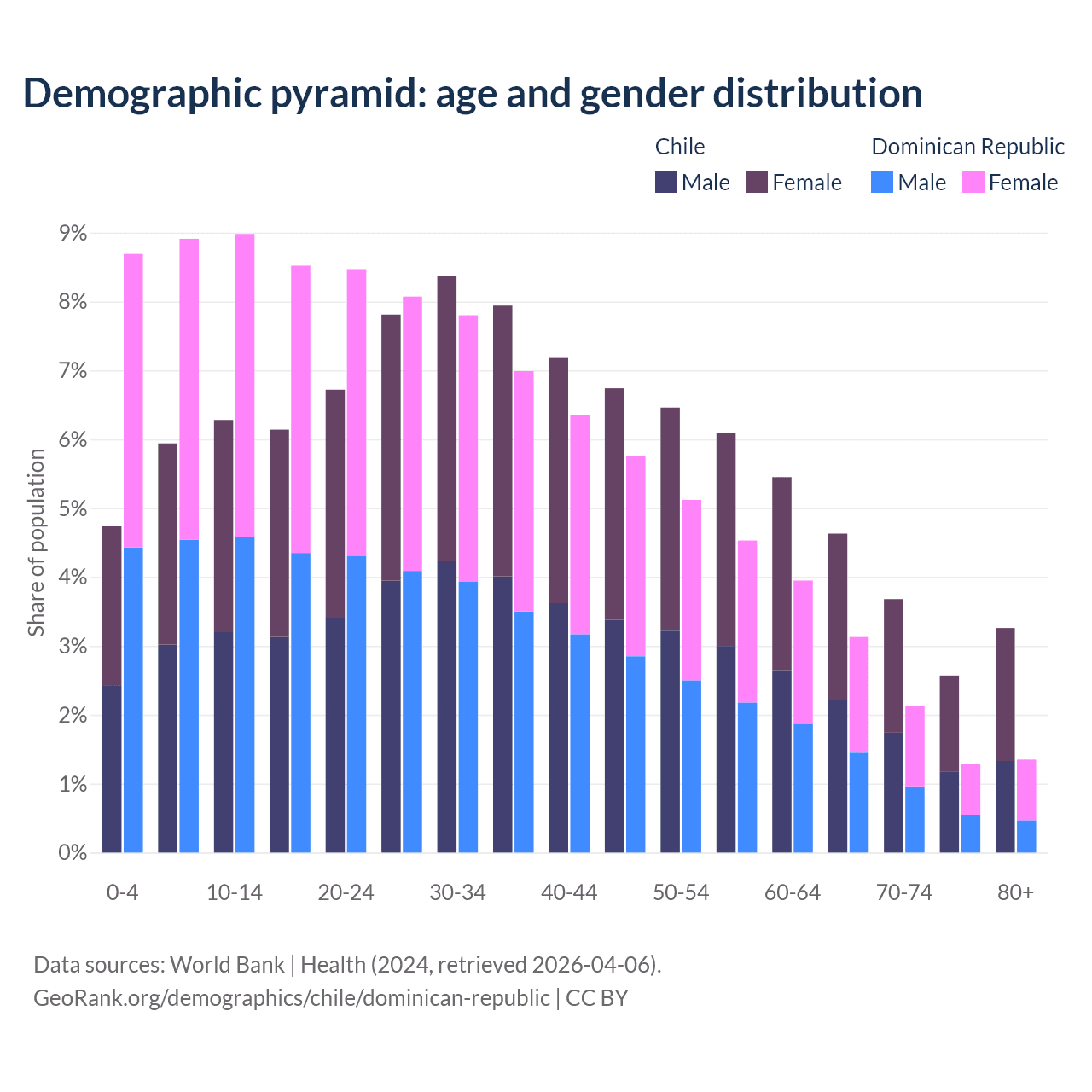 - Chile is ranked 61/196 by median age (oldest to youngest) vs 112/196 for the Dominican Republic.