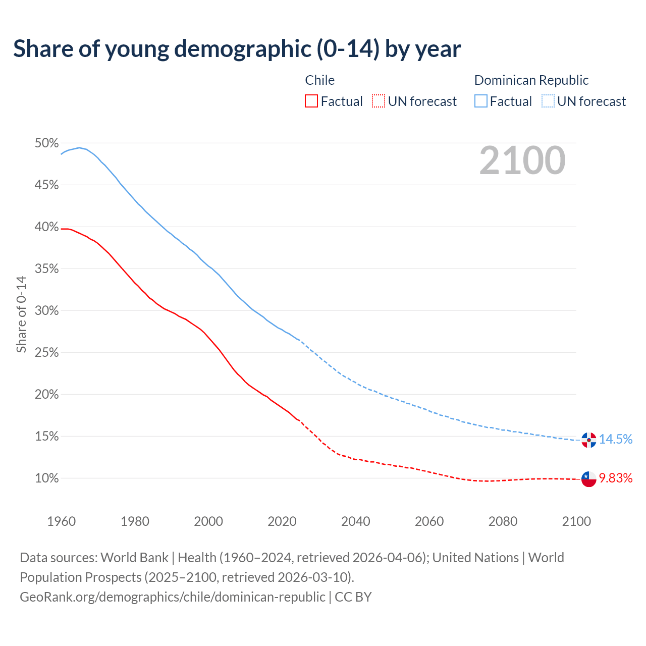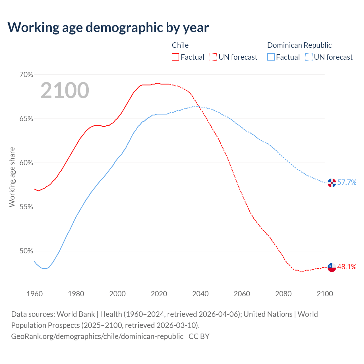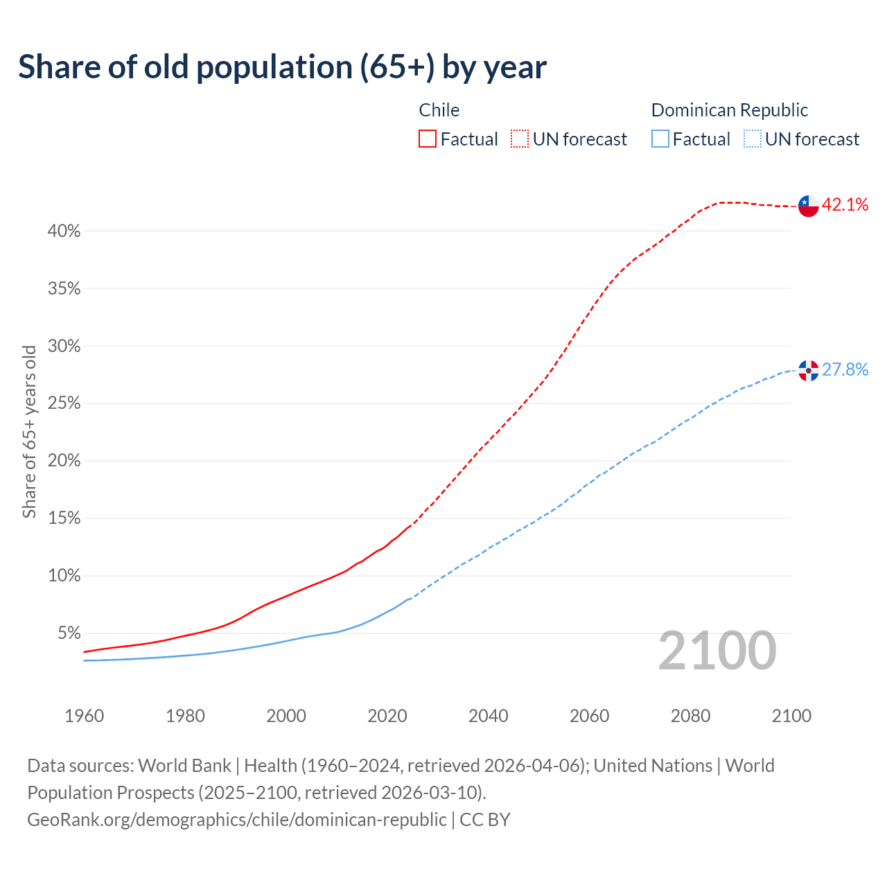 Median age Chile vs Dominican Republic, 1960-2100
