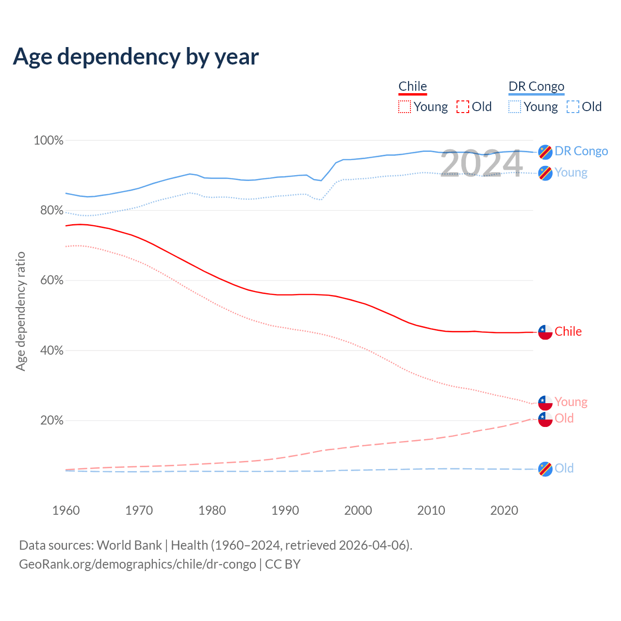 - The share of old-age demographic (65+) in Chile is 14.1% vs 3.08% in the DR Congo.