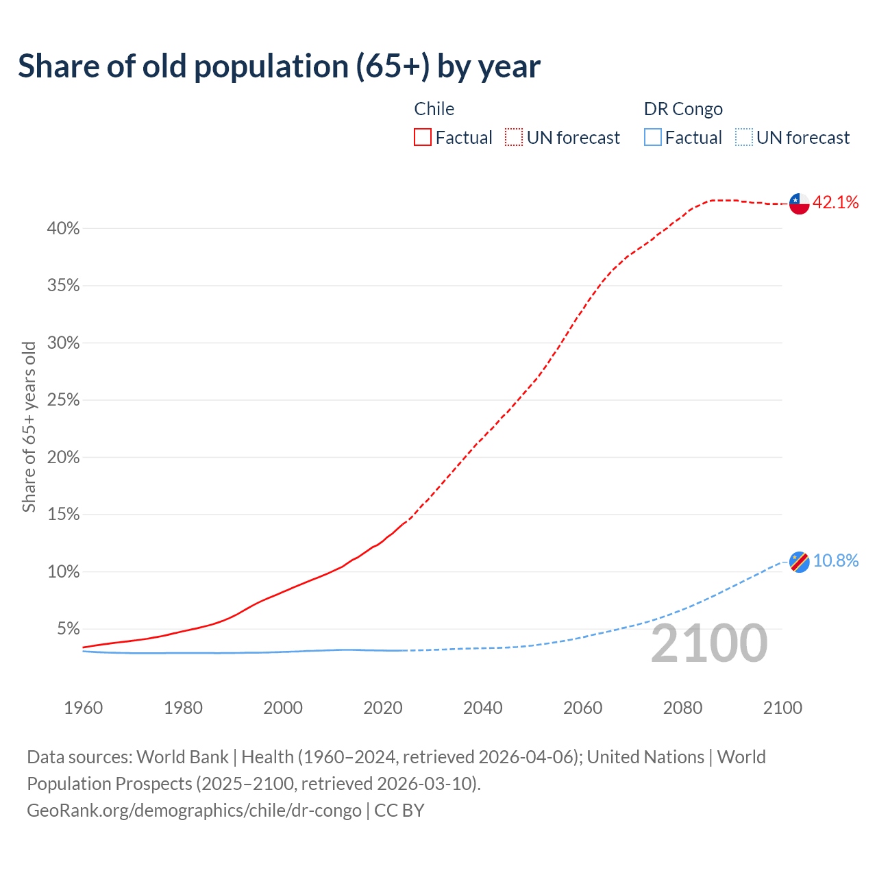 The share of older people aged 65 and over is 14.1% in Chile and 3.08% in the DR Congo. Life expectancy in Chile compared to the DR Congo .