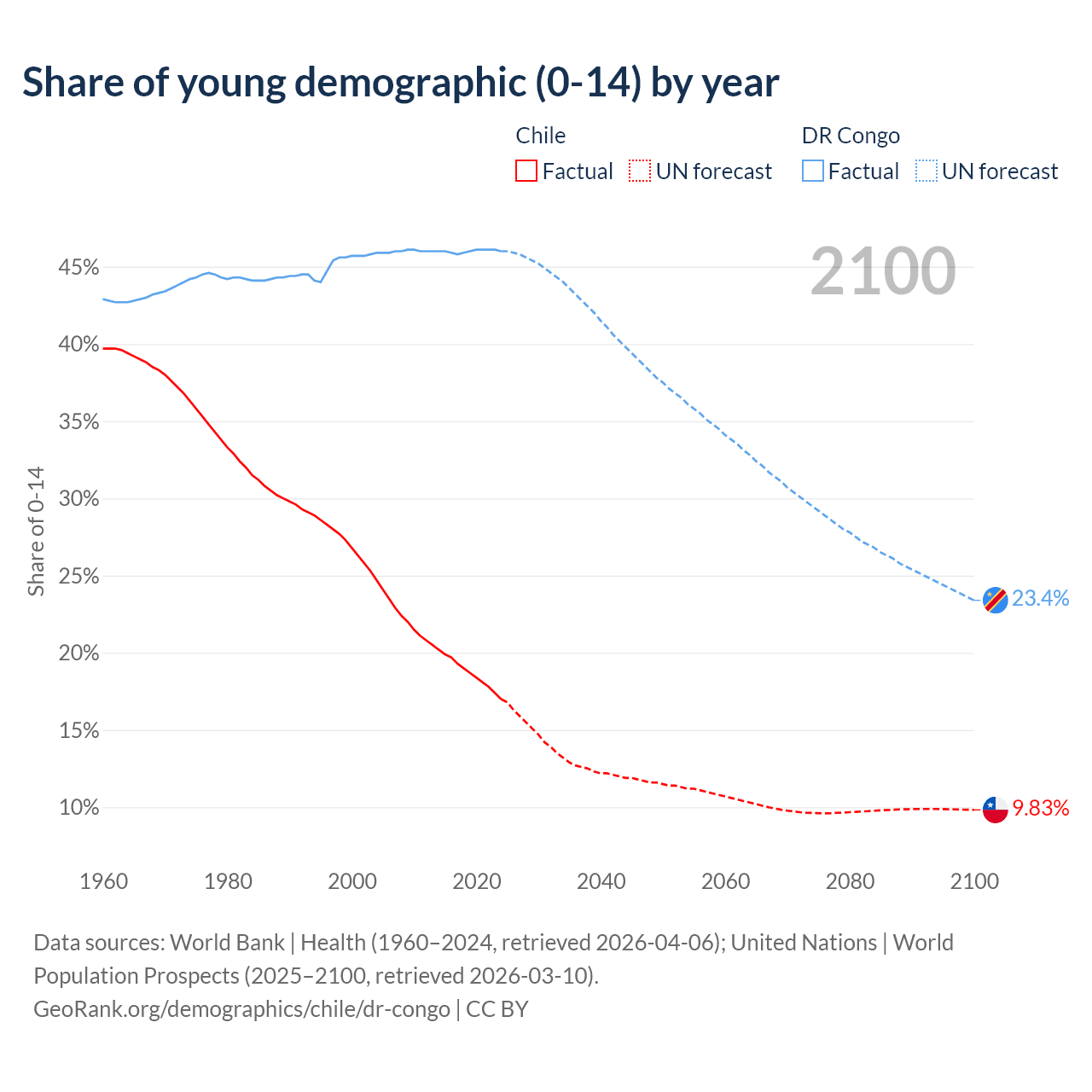 - The share of young demographic (0-15 years old) in Chile is 17% vs 46% in the DR Congo.