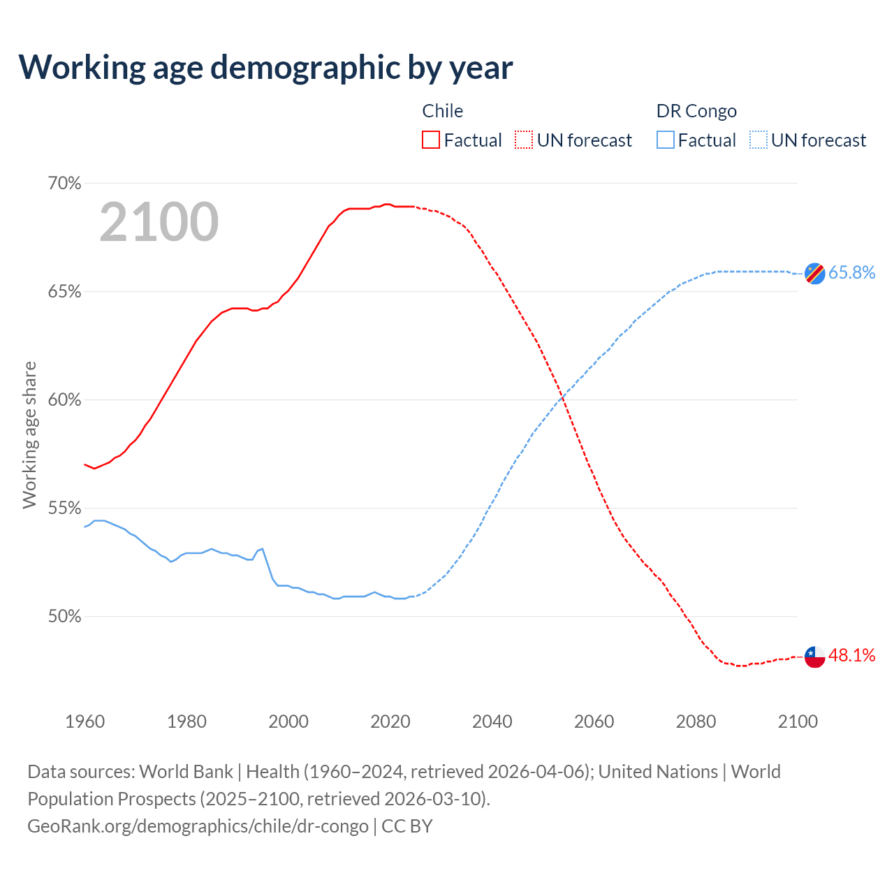 - Chile has 13.8M working age adults (aged 15-64) vs 59.8M in the DR Congo.