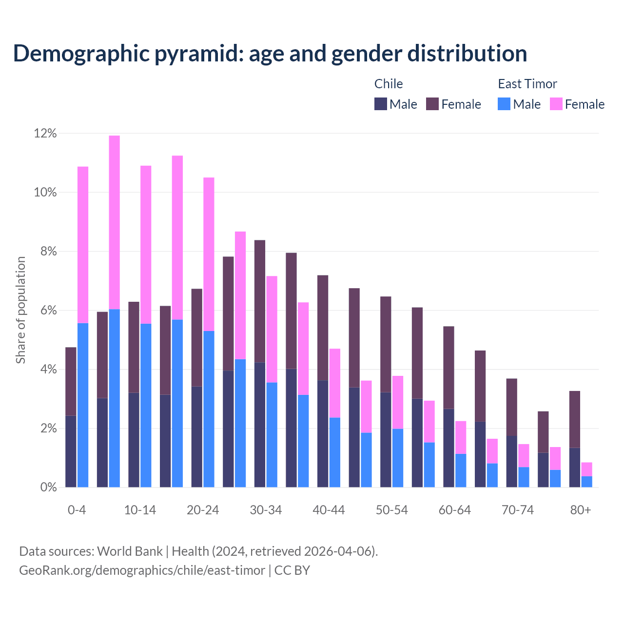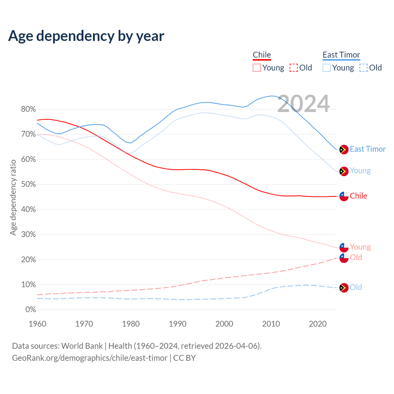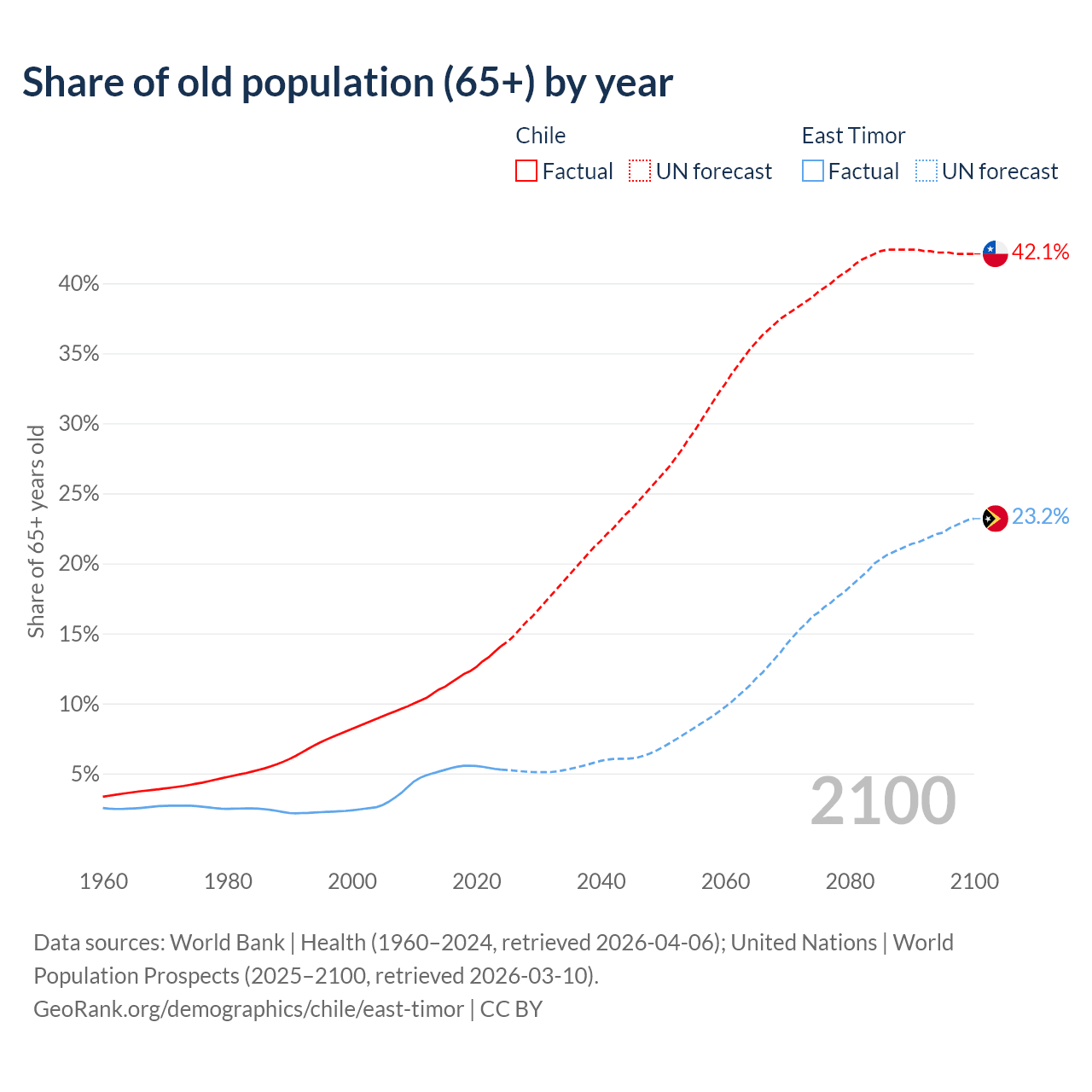 - The share of old-age demographic (65+) in Chile is 14.1% vs 5.28% in East Timor.