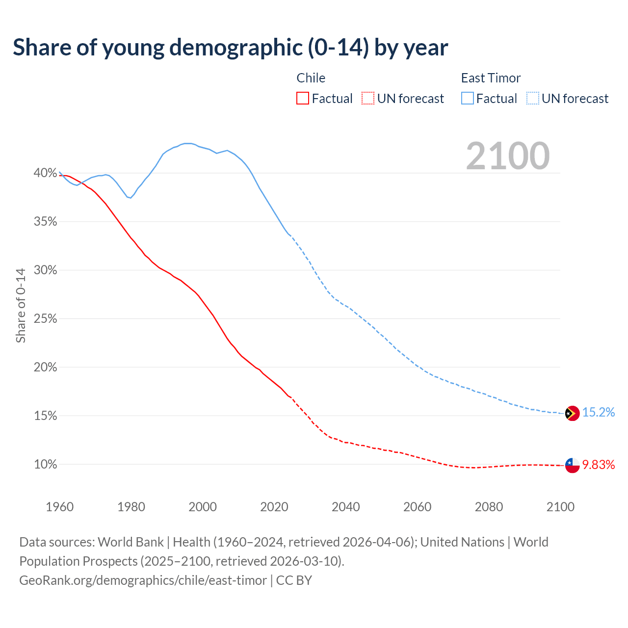 - The share of young demographic (0-15 years old) in Chile is 17% vs 33.7% in East Timor.