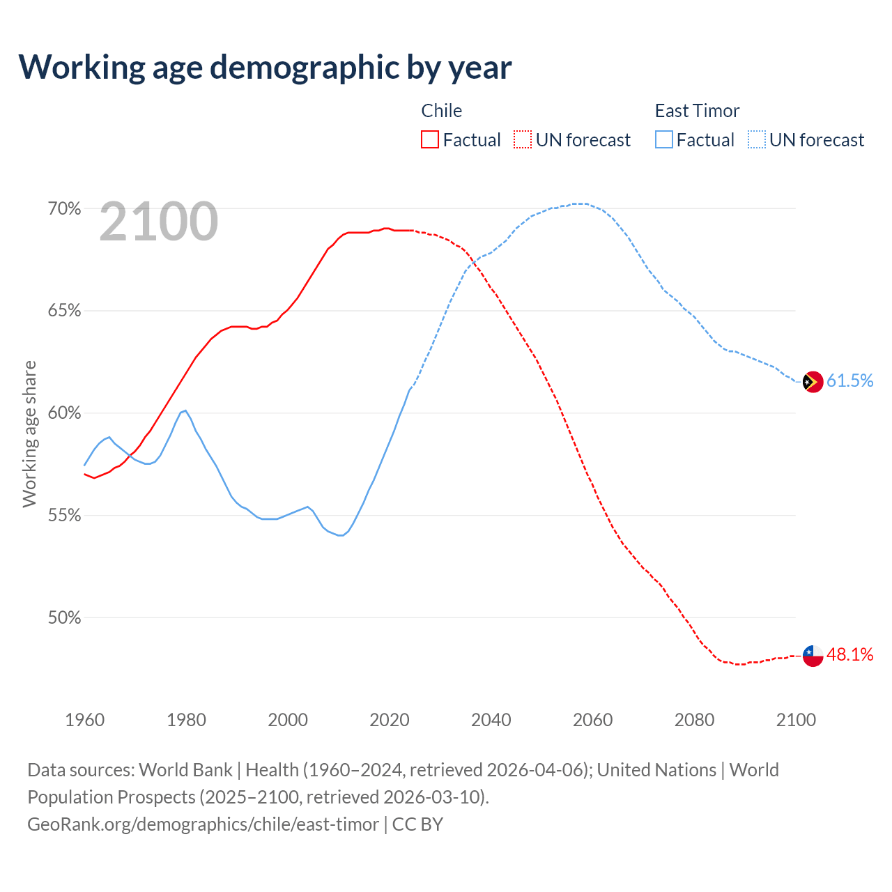 - Chile has 13.8M working age adults (aged 15-64) vs 880K in East Timor.