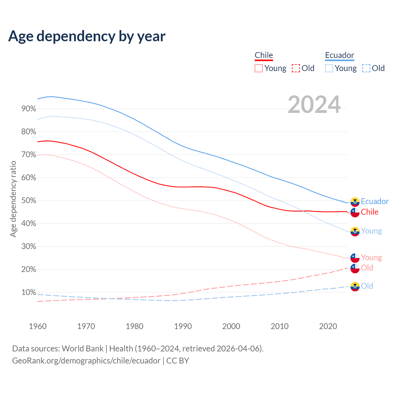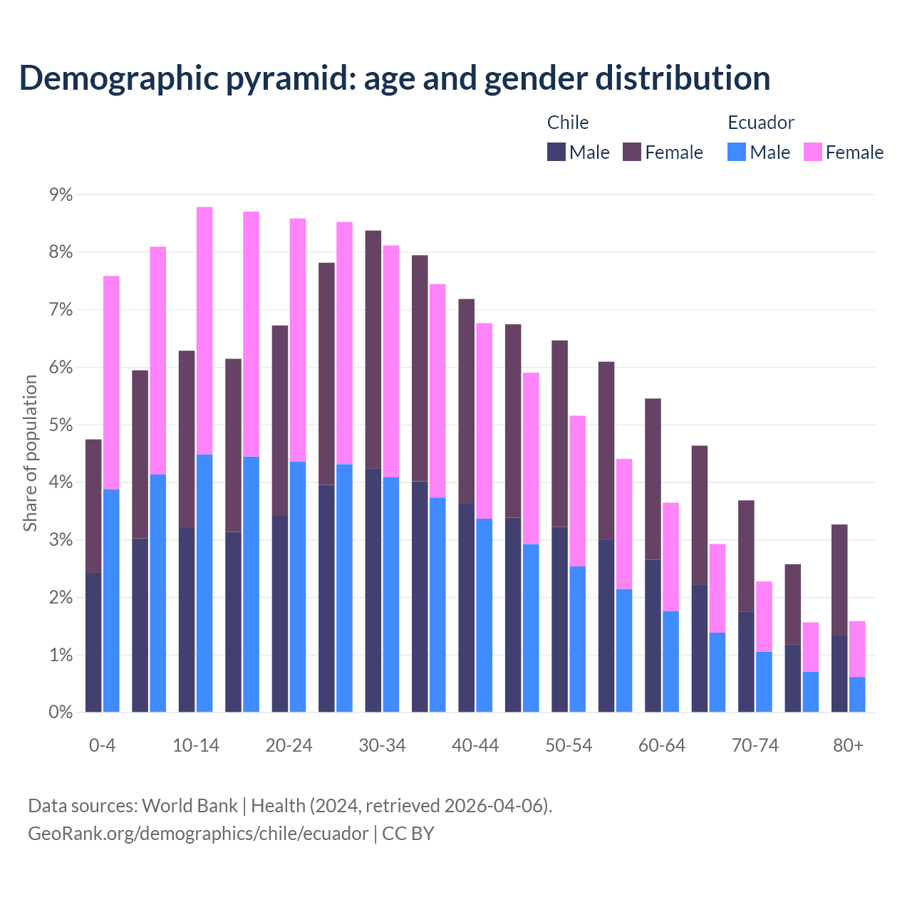 - Chile is ranked 61/196 by median age (oldest to youngest) vs 105/196 for Ecuador.