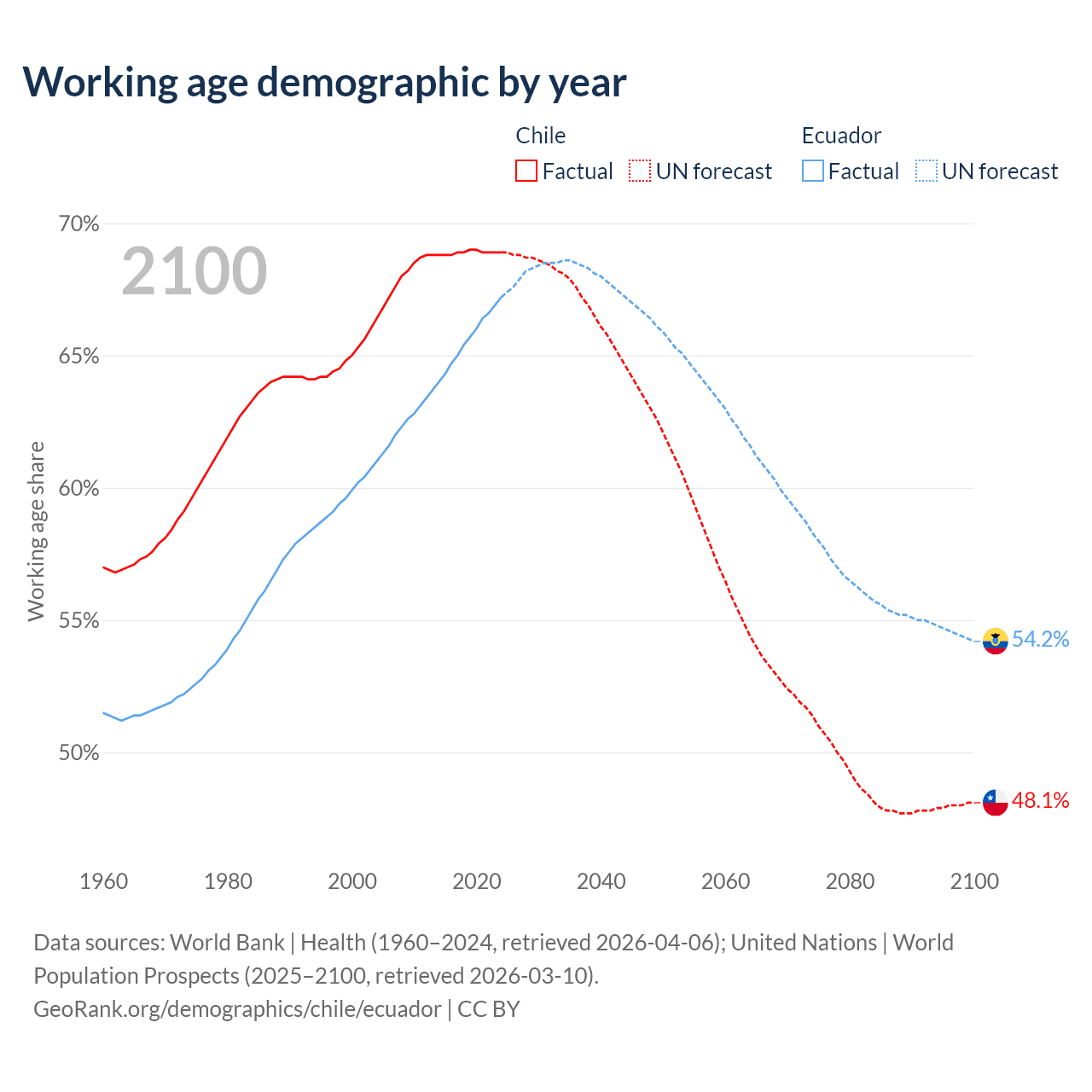 - Chile has 13.8M working age adults (aged 15-64) vs 12.4M in Ecuador.