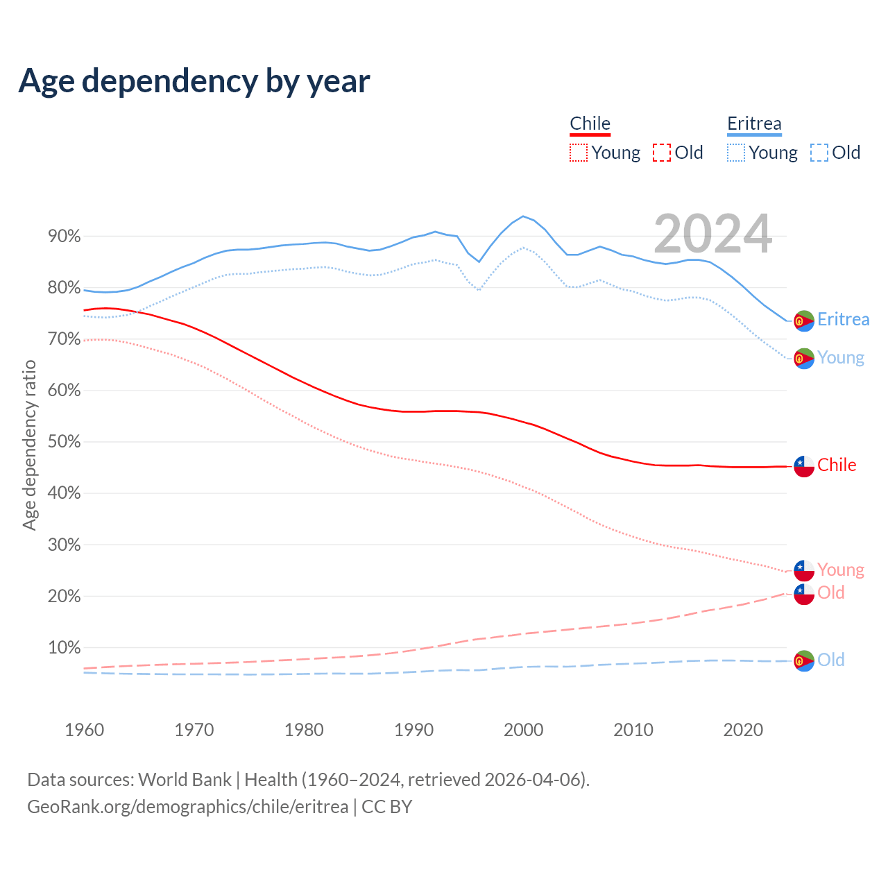 - The share of old-age demographic (65+) in Chile is 14.1% vs 4.2% in Eritrea.