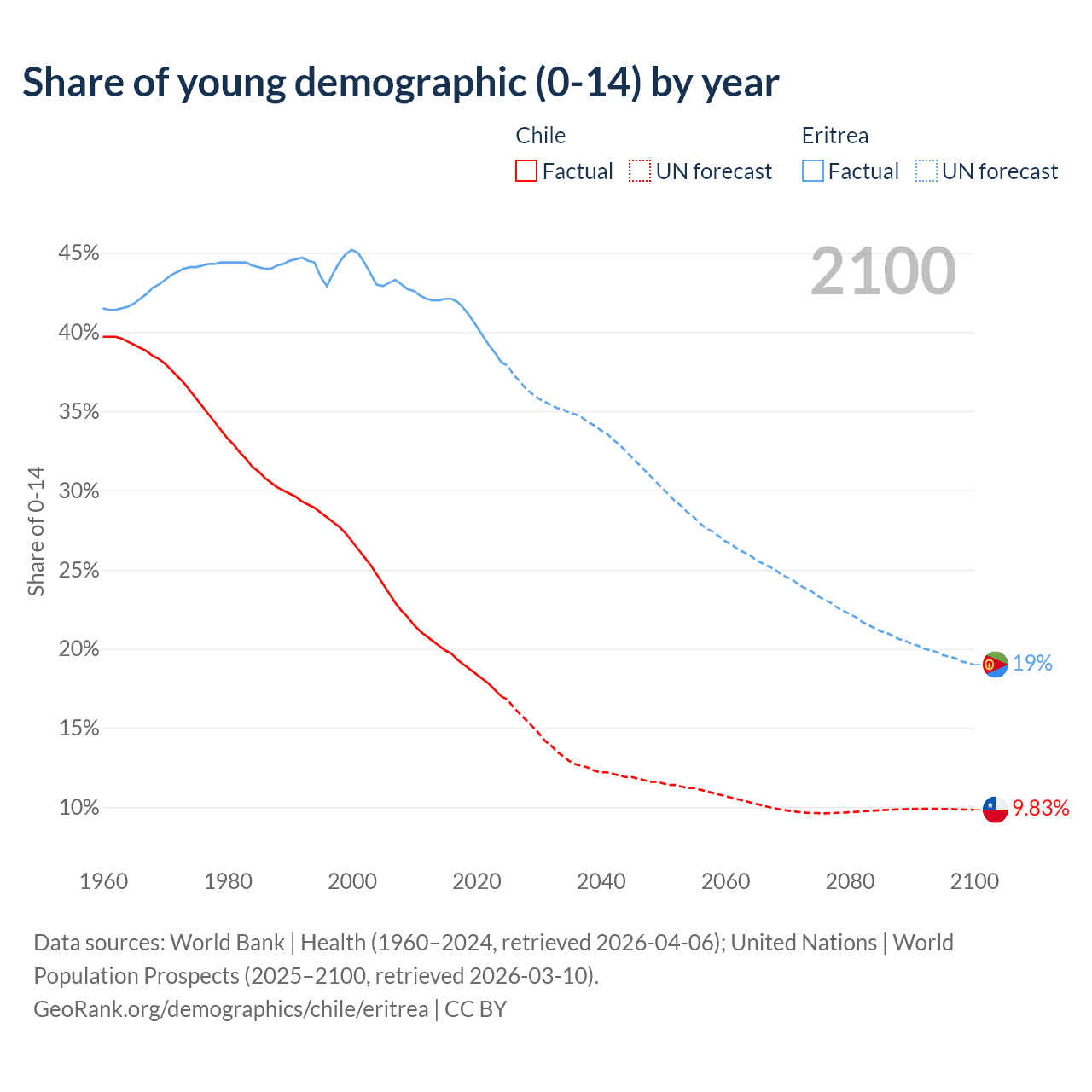 - The share of young demographic (0-15 years old) in Chile is 17% vs 38.1% in Eritrea.