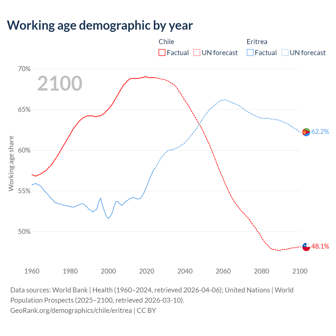 Median age Chile vs Eritrea, 1960-2100