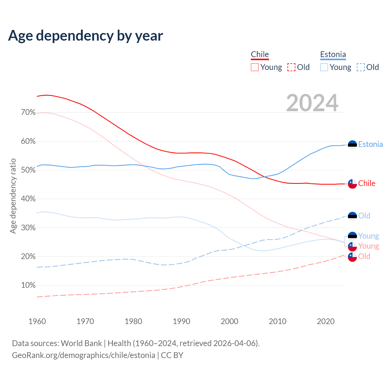 - Chile is ranked 61/196 by median age (oldest to youngest) vs 25/196 for Estonia.