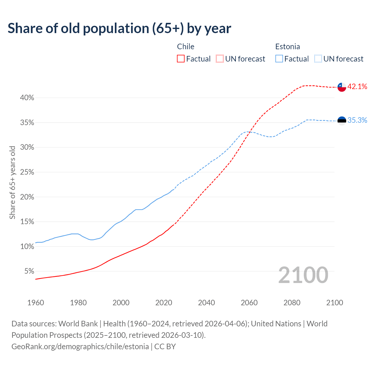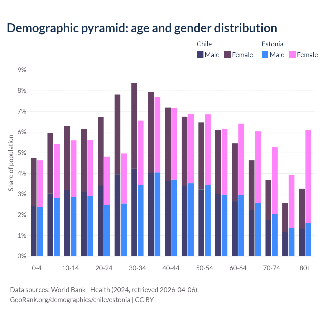 The share of older people aged 65 and over is 14.1% in Chile and 21.3% in Estonia. Life expectancy in Chile compared to Estonia .