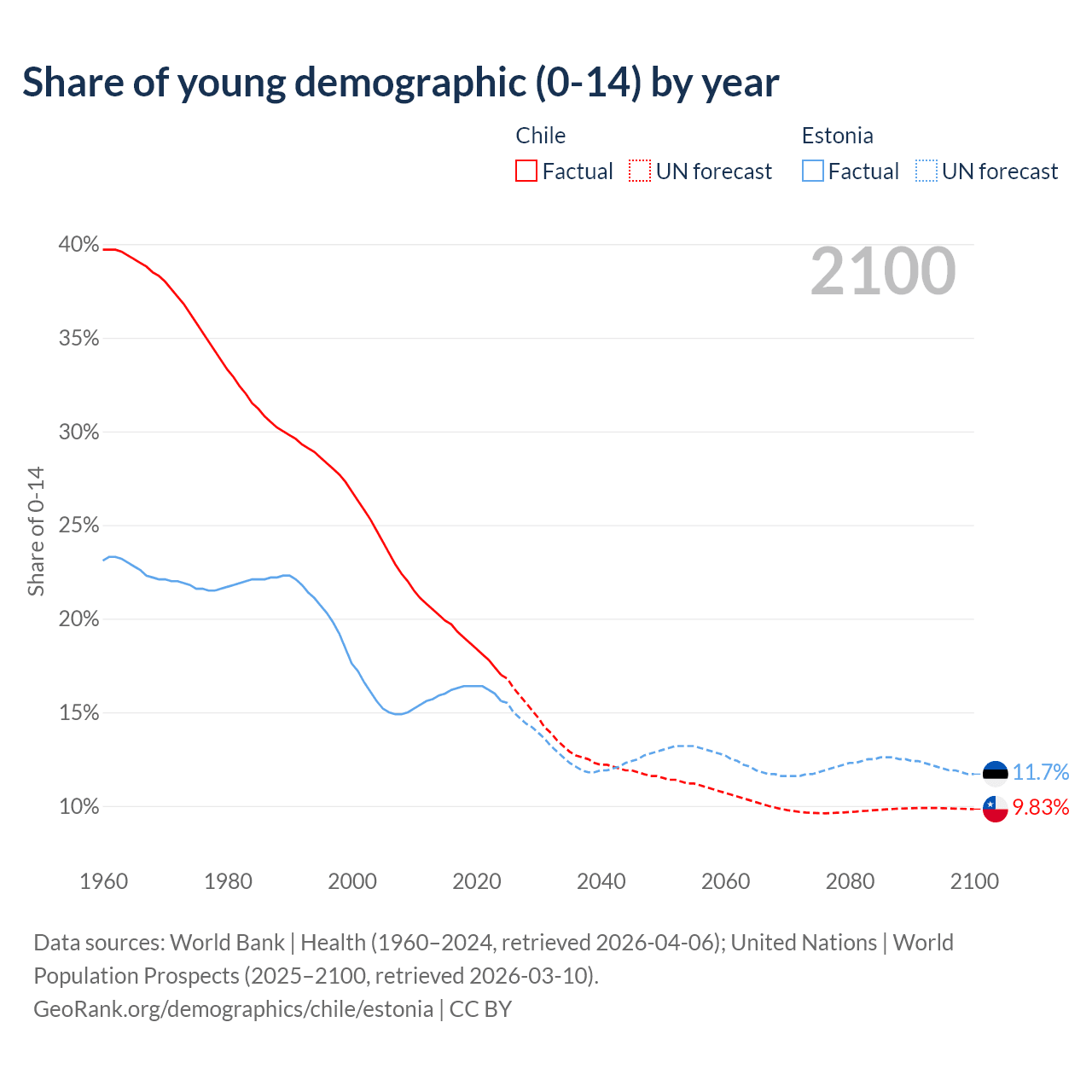 - The share of young demographic (0-15 years old) in Chile is 17% vs 15.6% in Estonia.