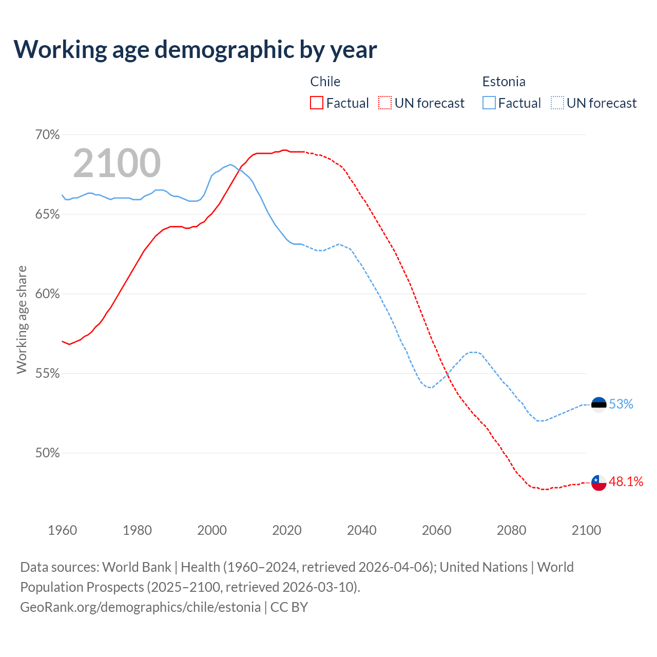 Median age Chile vs Estonia, 1960-2100