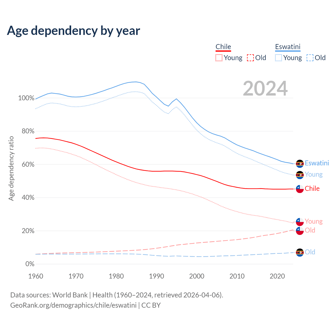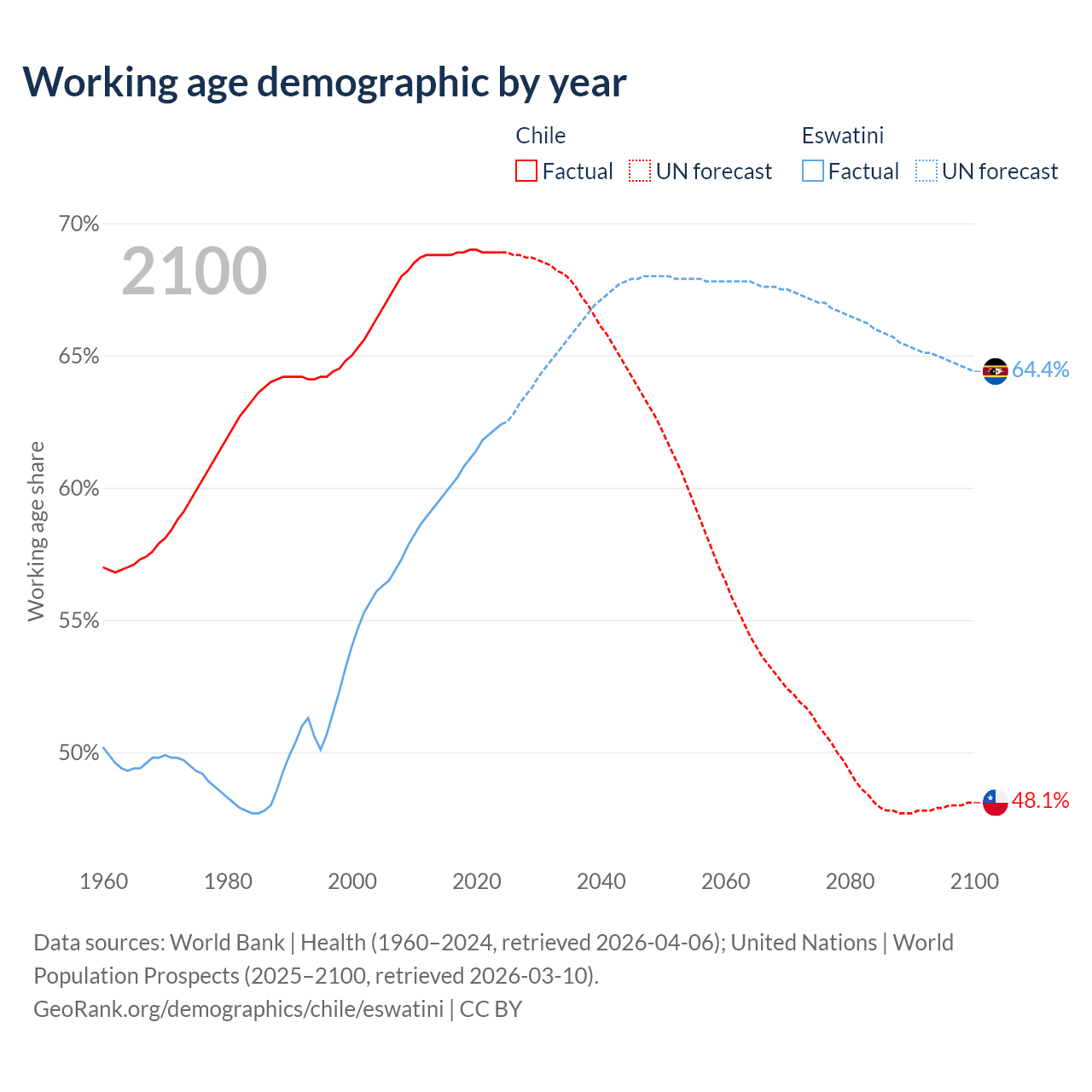 - The share of old-age demographic (65+) in Chile is 14.1% vs 4.26% in Eswatini.