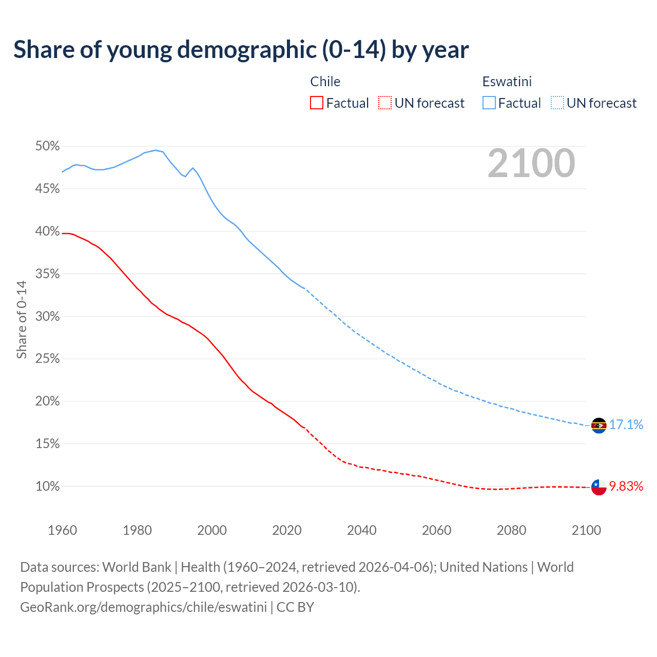 - The share of young demographic (0-15 years old) in Chile is 17% vs 33.4% in Eswatini.