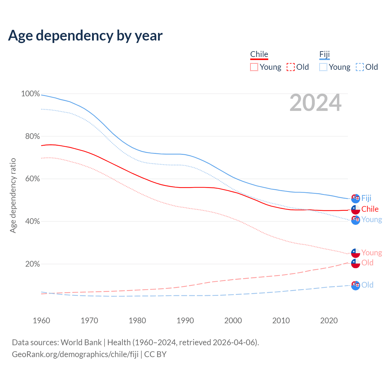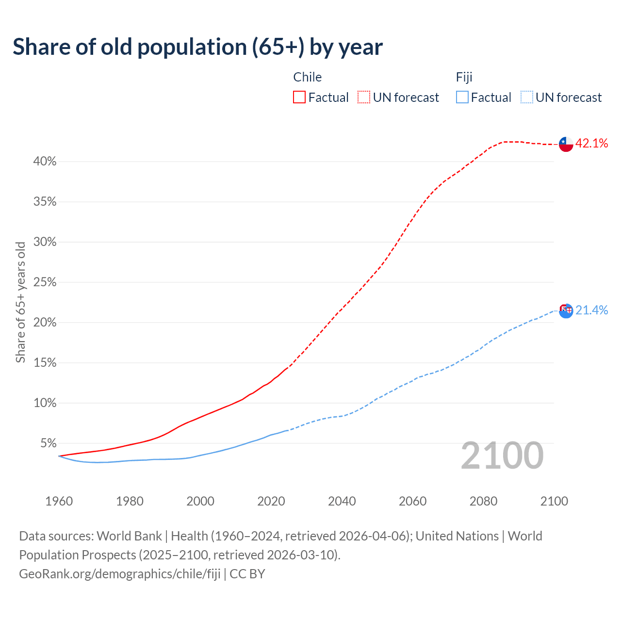 - The share of old-age demographic (65+) in Chile is 14.1% vs 6.49% in Fiji.
