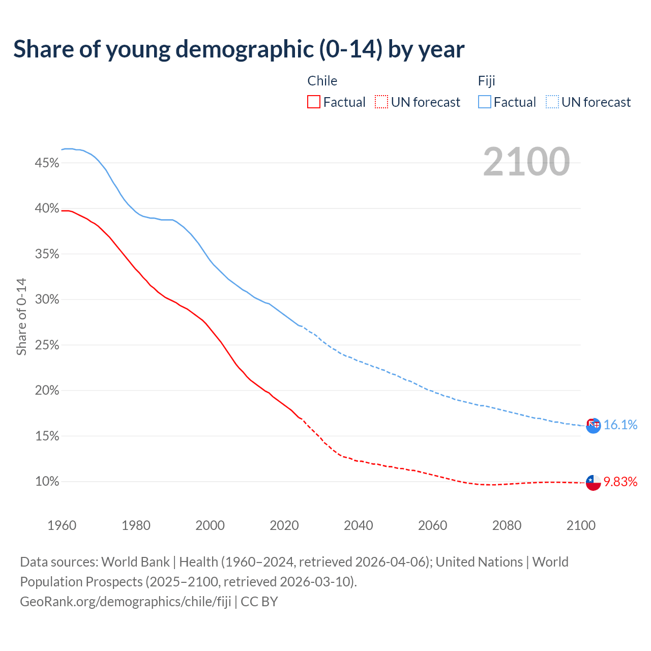 - The share of young demographic (0-15 years old) in Chile is 17% vs 27.1% in Fiji.