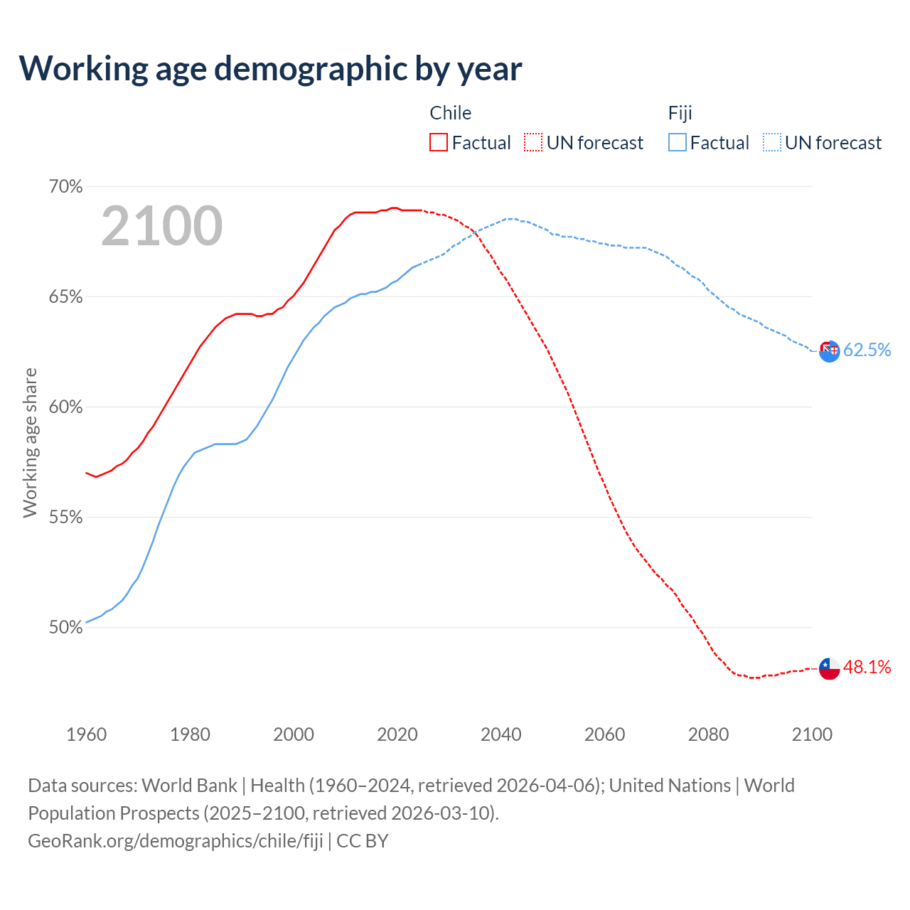 - Chile has 13.8M working age adults (aged 15-64) vs 623K in Fiji.