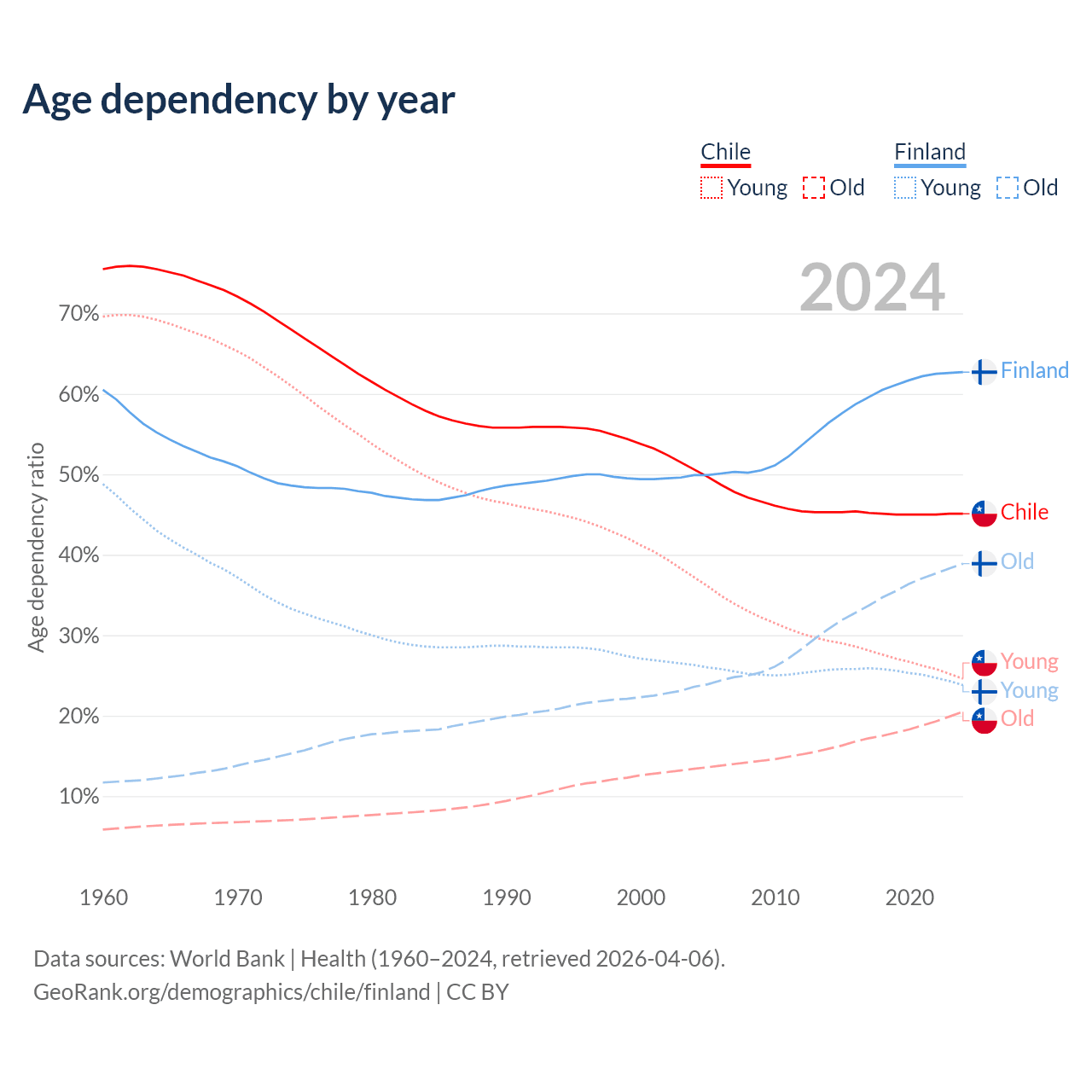 - Chile is ranked 61/196 by median age (oldest to youngest) vs 22/196 for Finland.