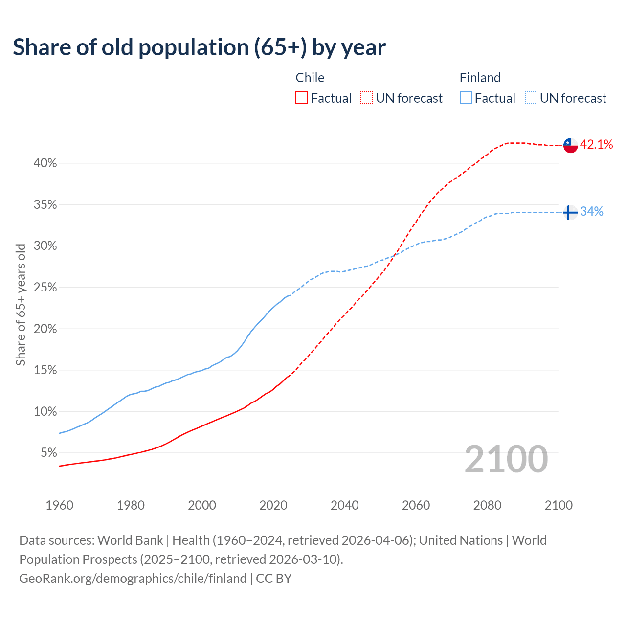 - The share of old-age demographic (65+) in Chile is 14.1% vs 23.9% in Finland.