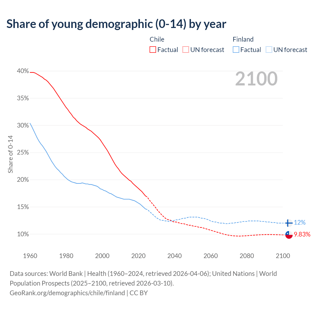 - The share of young demographic (0-15 years old) in Chile is 17% vs 14.6% in Finland.